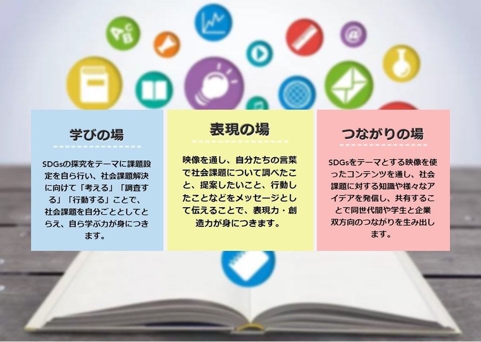 大学生実行委員会が運営主体となり、SDGsをテーマに中高生から動画作品を募集し、審査・表彰を行います。また特設サイトを通してSDGs教材の発信や、オンラインイベントを開催。これからの未来を担う中高生のメッセージを世の中に広く伝え、中高生、大学生、企業が双方向につながり、「社会を変える広がり」を創出することを目的としています。
