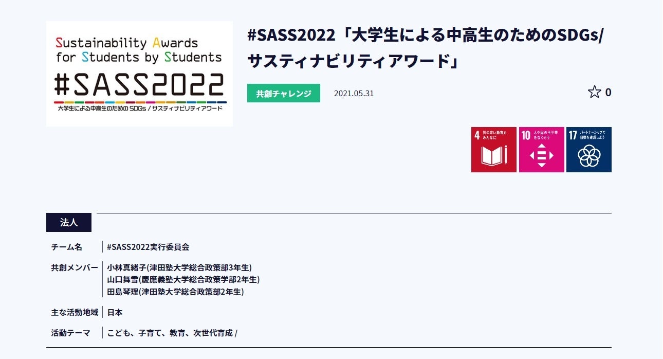 #SASS2022「第3回 大学生による中高生のためのSDGs/サスティナビリティアワード」~2023年2月15日まで動画作品応募受付中!~