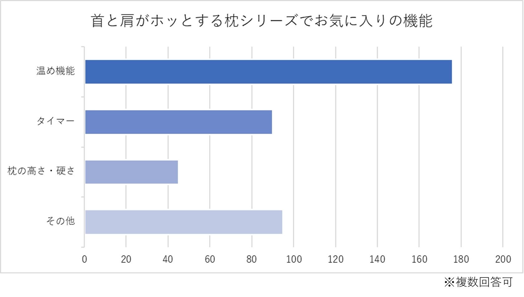 2024年に自社ECサイトにてご購入いただいたお客様に、アンケート(回答数236件)にご協力いただきました結果、ユーザーのお気に入り機能TOP3は「温め機能」、「タイマー」、「枕の高さ・肩さ」でした。特に「温め機能」については、この機能に期待して購入している方が多い中で、非常に嬉しい結果となりました。