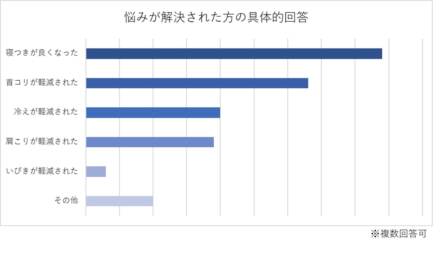 また、枕の利用で悩みが解決されたとお答えいただいた方の中で、最も多かったのは「寝つきが良くなった」で、首と肩がホッとする枕シリーズの特徴である、首・肩を40度で温めることで、とろけるような眠りを実感いただけています。その他、首コリ、肩コリが軽減されたという声も多く、中には翌日すぐにコリが楽になったという回答もいただいています。