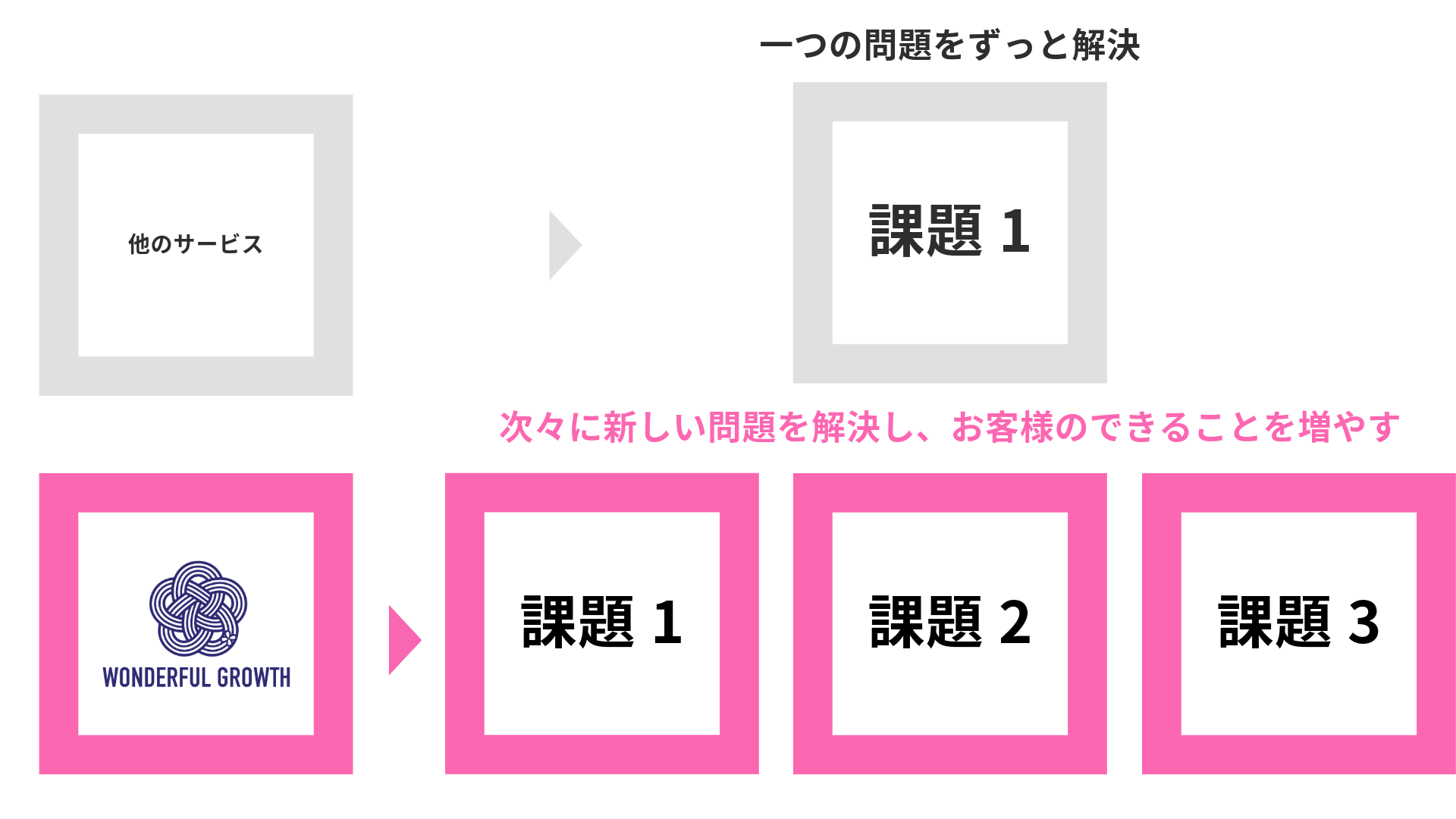 WONDERFUL GROWTHは、現在までにお取り組みさせていただいただいた企業のみなさなと、これからお取り組みさせていただくみなさまの組織成長に貢献し、10年後の未来によりよい社会と育成機会の提供を広げていくことを実現します。