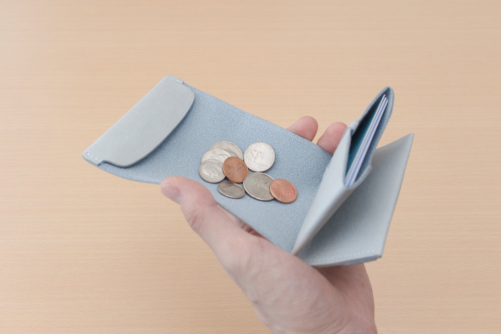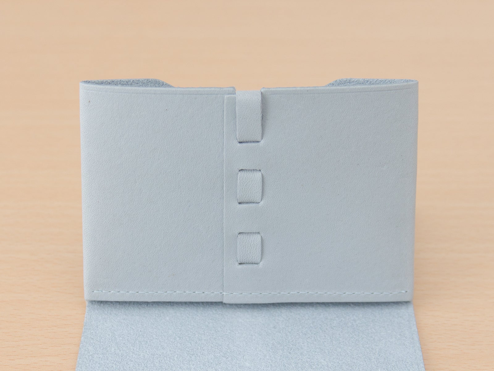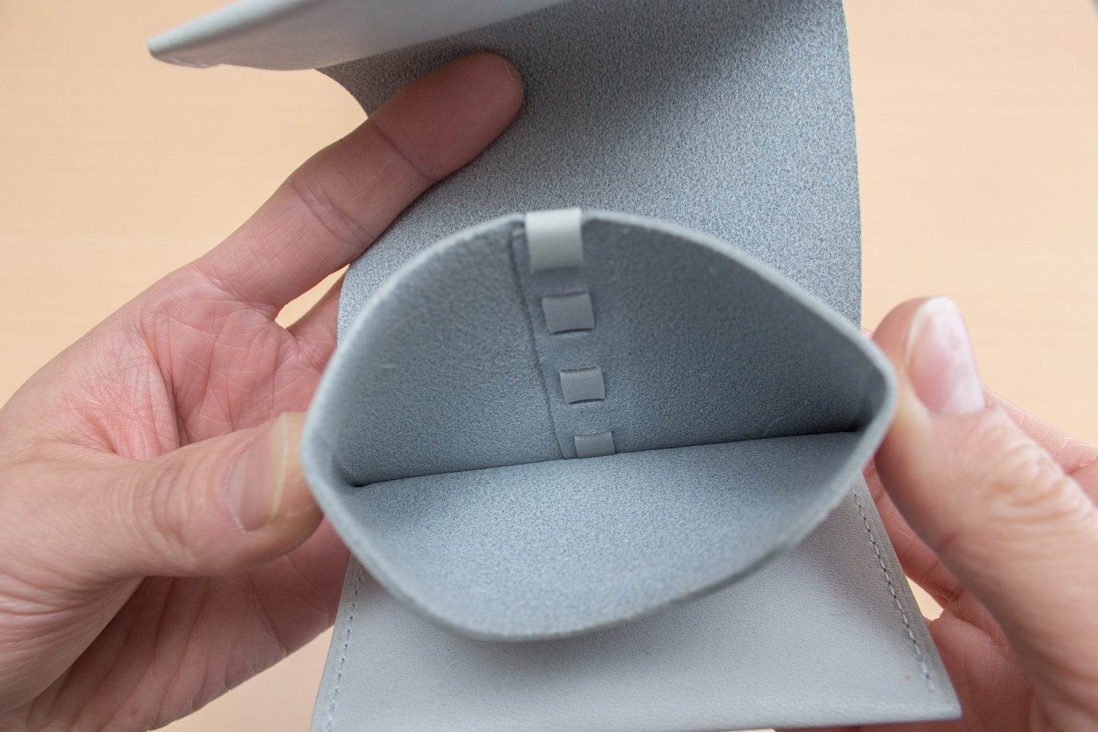 フラップは収納量が適量を超えると自然に閉まらなくなり、持つべき量を感覚的に知らせます。前ポケットでは革の内側の毛羽立ちがカードを掴み、少ない枚数でも安定して保持します。後ろのポケットでは革が受け皿となり、毛羽立ちが滑り止めとして働き、フラップが硬貨の飛び出しを防ぎます。構造全体が、自然な動作の中で整った使い方へと導く設計です。