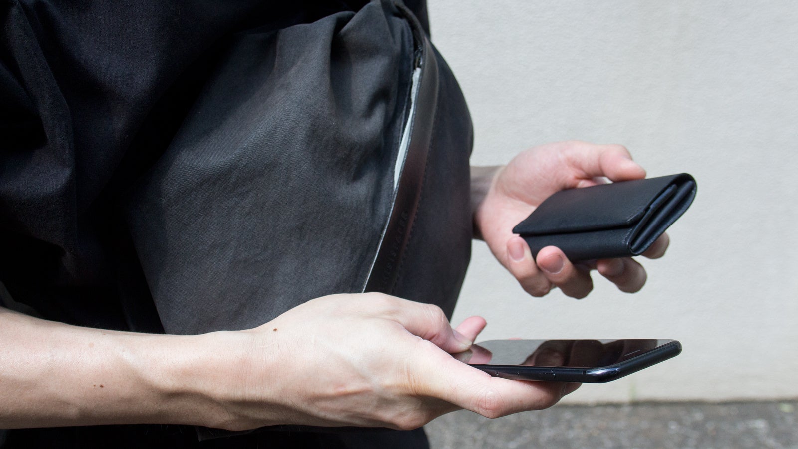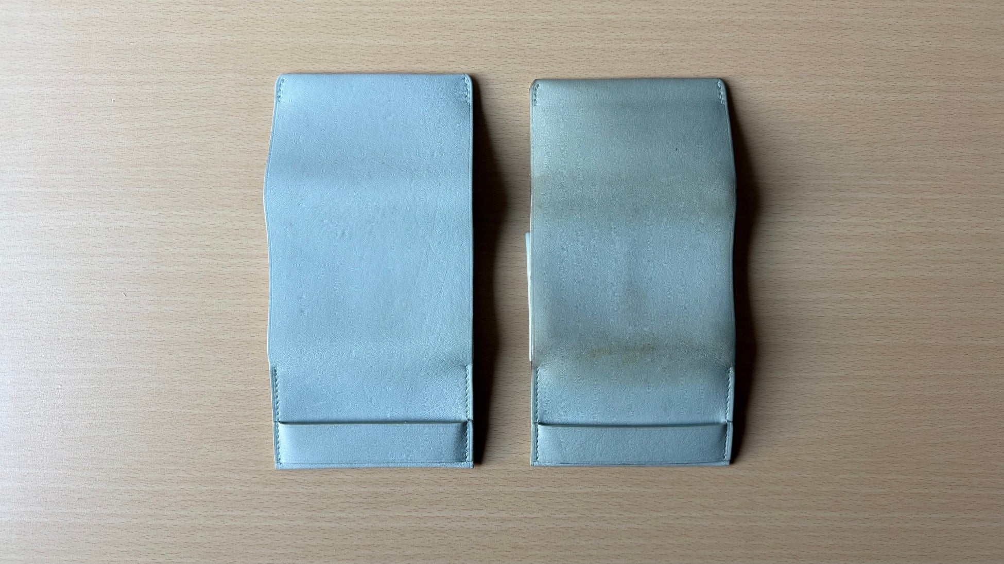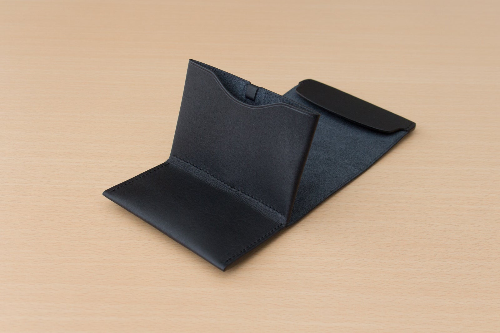フラップは収納量が適量を超えると自然に閉まらなくなり、持つべき量を感覚的に知らせます。前ポケットでは革の内側の毛羽立ちがカードを掴み、少ない枚数でも安定して保持します。後ろのポケットでは革が受け皿となり、毛羽立ちが滑り止めとして働き、フラップが硬貨の飛び出しを防ぎます。構造全体が、自然な動作の中で整った使い方へと導く設計です。