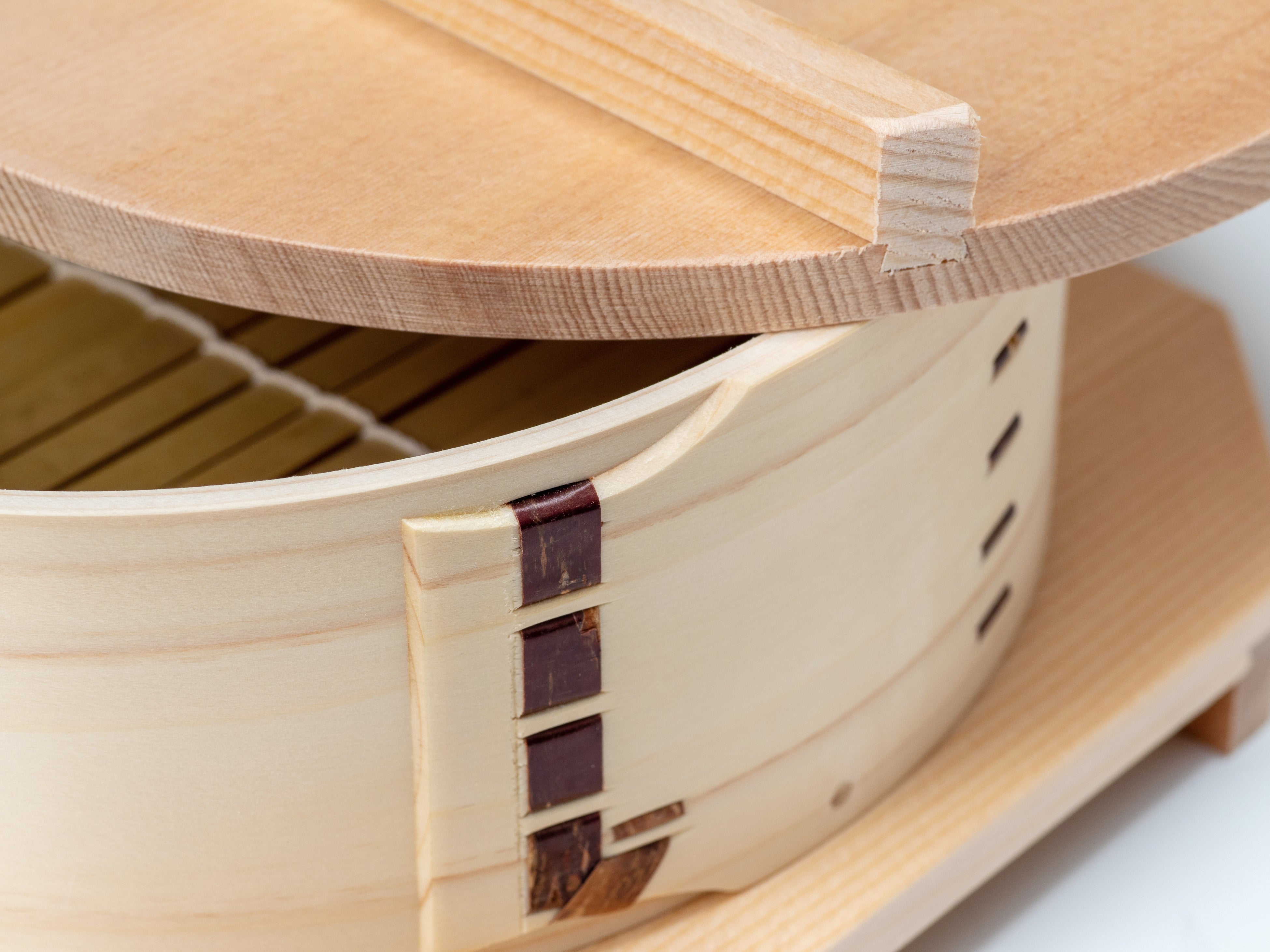 前面ポケットは、曲げわっぱなどの桜皮綴じに着想を得た「革綴じ製法」による筒型構造で、縫い目をなくすことで裂けにくくしています。