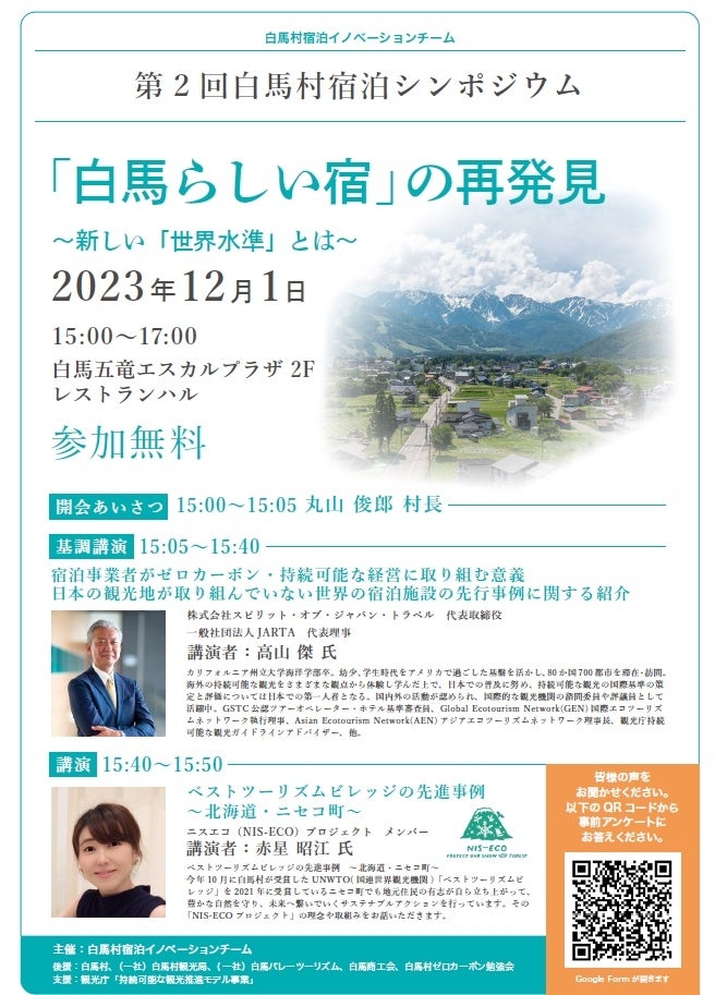 「ベストツーリズムビレッジ」を受賞した白馬村で、持続可能な観光の国際基準の策定と評価について日本での第一人者・高山 傑さんの講演や白馬と同じスノーリゾート北海道・ニセコ町での取組などのシンポジウム開催
