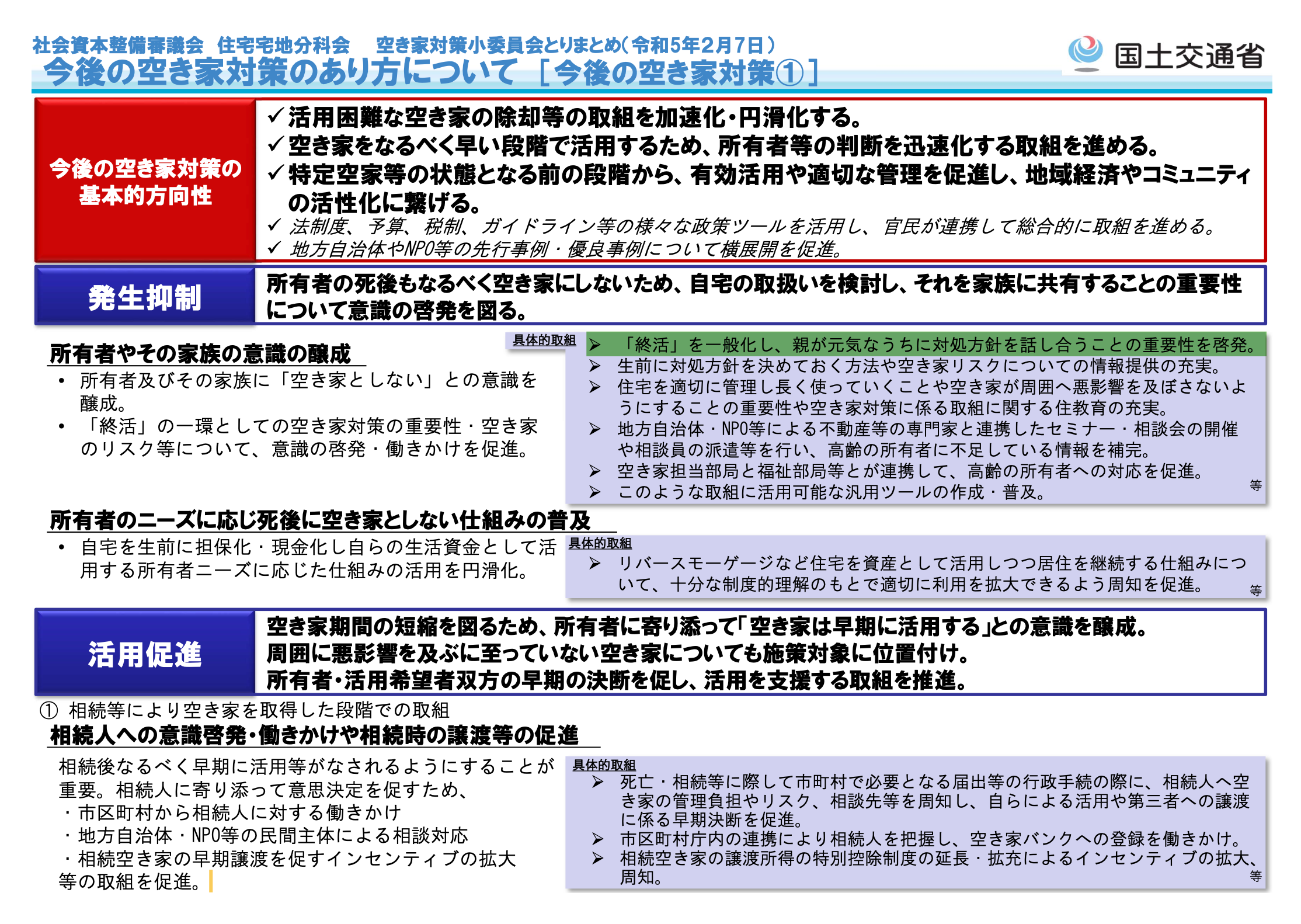 本年度開催された、国土交通省空き家対策小委員会での取りまとめによると、空き家の発生抑制などの取り組み強化についての議論が進められており、「終活」として空き家対策の重要性や意識啓発についての必要性について説かれております。