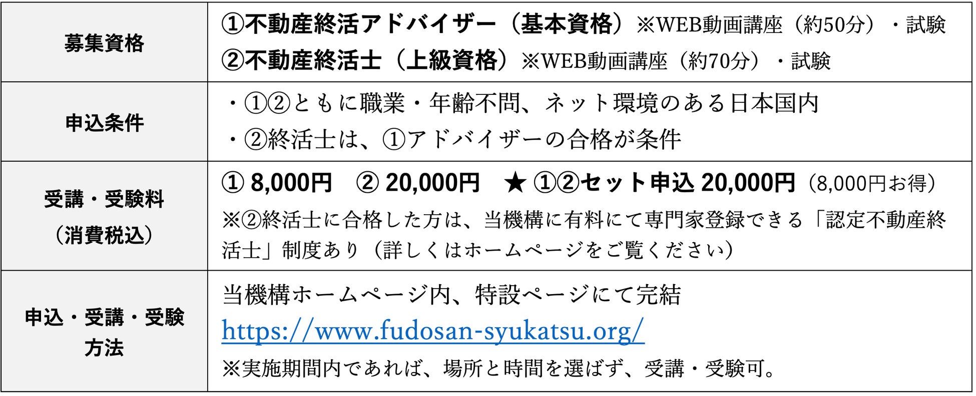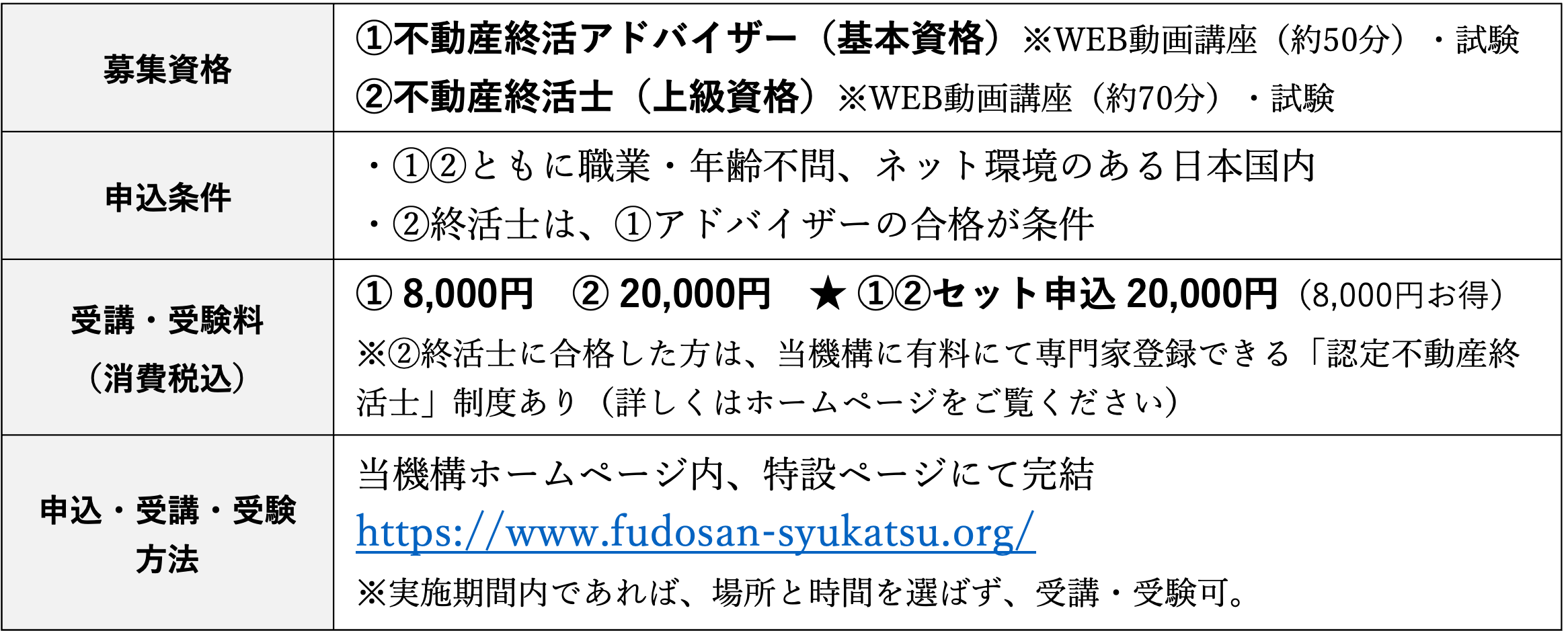 悩みを抱えた方に寄り添い、適切な専門家へアシスト出来る「不動産終活アドバイザー」と、解決へと導ける専門家である「不動産終活士」の二つの資格で、不動産終活の後押しを行います。申し込みから、受講、受験、合否の結果通知まで、全てWEB上で行えるシステムとなっており、実施期間内であれば、全国どこでも、どなたでも都合のよい時間に合わせて、受講・受験できるのが本資格制度の特長です。