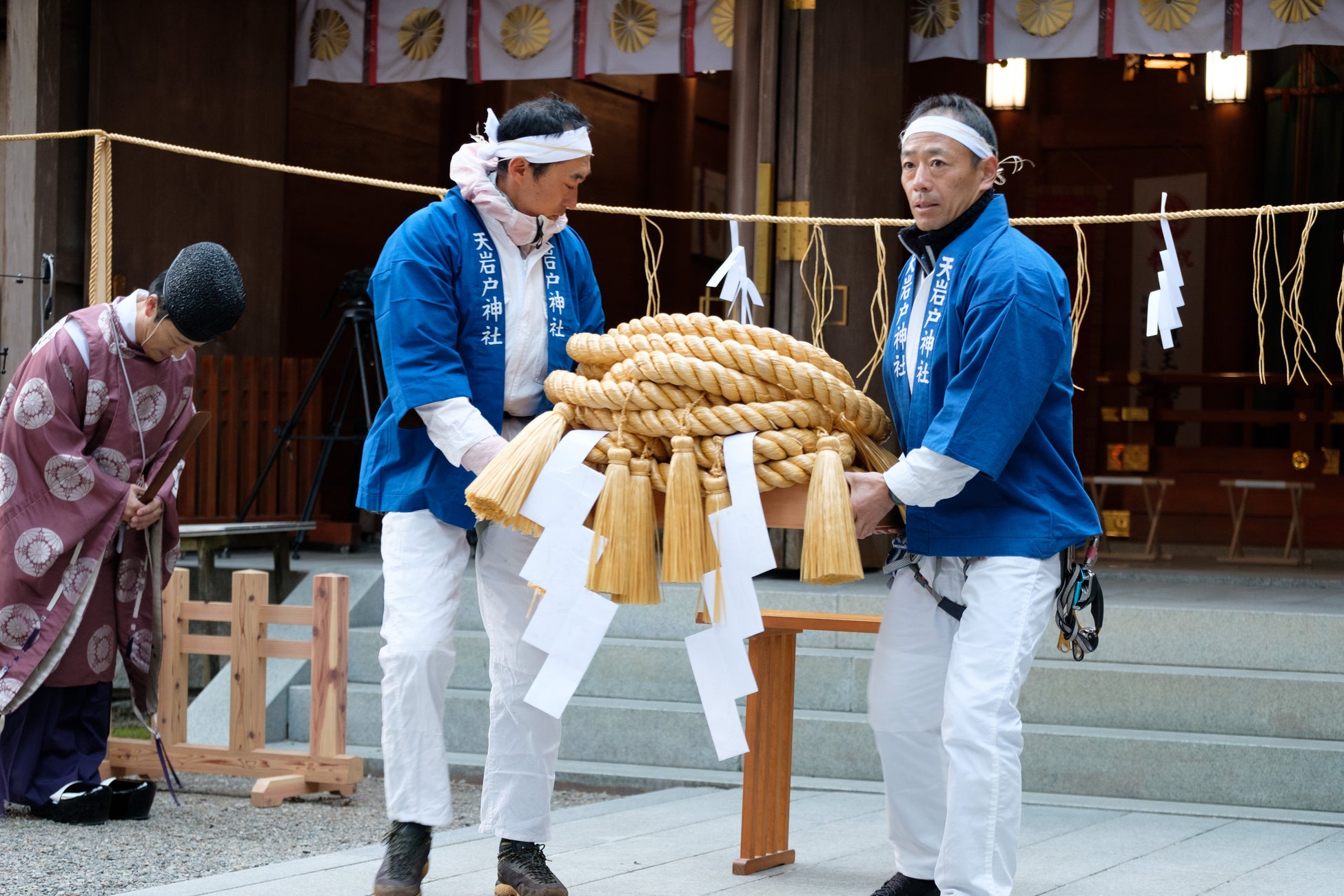 令和三年より、神話に描かれた注連縄張り神事を伝統行事として後世に残し、神話の継承と、明るい世の中が末永く続くようにとの願いを込めて、天岩戸神社では、毎年冬至の日に注連縄の張替えを行い、神事として伝えていくための年末の恒例行事として多くの方に親しまれています。