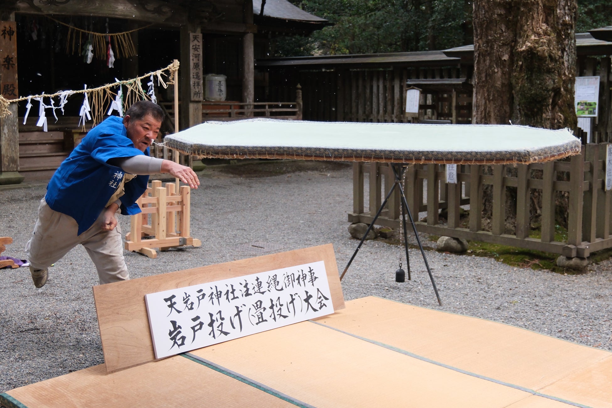 また、『天岩戸注連縄張神事』は、かつて天岩戸神社で行われていた畳を投げる「岩戸投げ大会」を今年も開催します。「岩戸投げ大会」は、天岩戸伝説の中で、天照大御神(あまてらすおおみのかみ)がお隠れになられた天岩戸をこじ開けた力の神様・手力男命(たぢからをのみこと)に由来するものです。手力男命が投げ飛ばした岩戸は、長野県の戸隠に飛ばされ戸隠山になったと伝えられており、この岩戸を模して重さ約20Kgの畳を投げ、その距離を競うもので、どなたでもご参加いただくことができます。