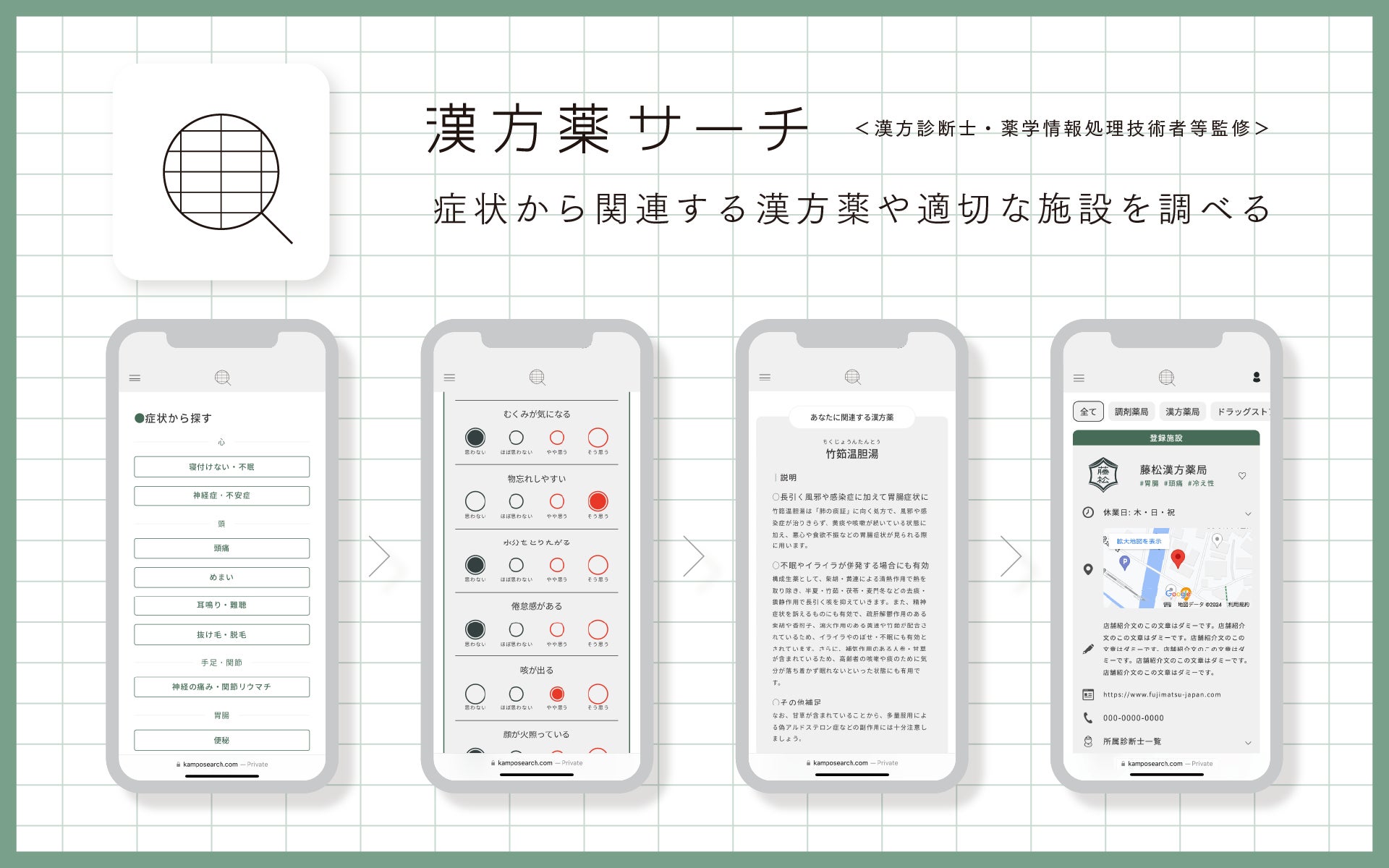 「名前のない病気をなくす」を掲げ、漢方×AIをベースとしたヘルステクノロジーを提供するFUJIMATSU(合同会社藤松 代表:加藤寛隆)から「漢方薬サーチ」がローンチされました。ユーザーはオンライン上で問診をするだけで、いつでも自分の症状に関連する漢方薬がレコメンドされます。また、漢方薬を相談できる薬局や病院を探すことができます。