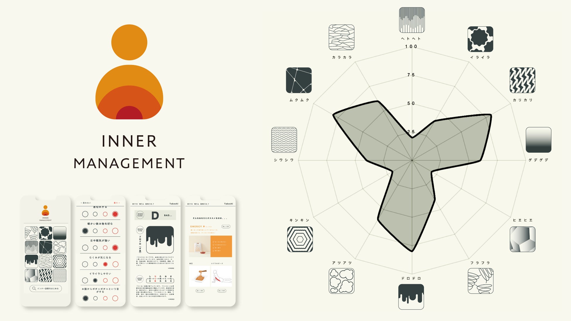 知りたくても知れなかったインナーの状態を「可視化」し、インナーの状態に合ったモノコトを「マッチング」できるAIです。漢方×AIをベースとして、体質・趣向・性格など100万通り以上の分類から心身全体のバランスを独自のアルゴリズムで分析・可視化しています。メンタルとフィジカルの両面を捉え、各個人の持続可能な健康習慣の提供を可能にします。