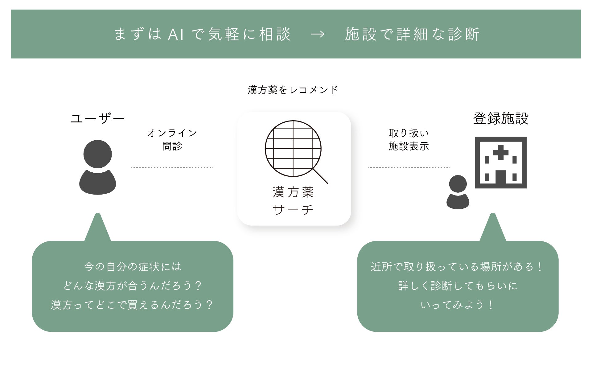 漢方薬は認知があるものの、その複雑さゆえに、エントリーしづらいのが現状です。一方で、治療の選択肢として漢方薬のニーズは高まっています。自分に関連する漢方薬を、オンラインで、いつでも、何度でも、無料で調べられ、漢方を求める患者さんと漢方薬の距離を近づけたいという想いから開発が始まりました。また、世界的に様々な病気が蔓延している中で、医薬品不足・医療従事者不足が起こっています。業界としての協力体制を築き、西洋医学も含めた医療の一助となることを目指しています。