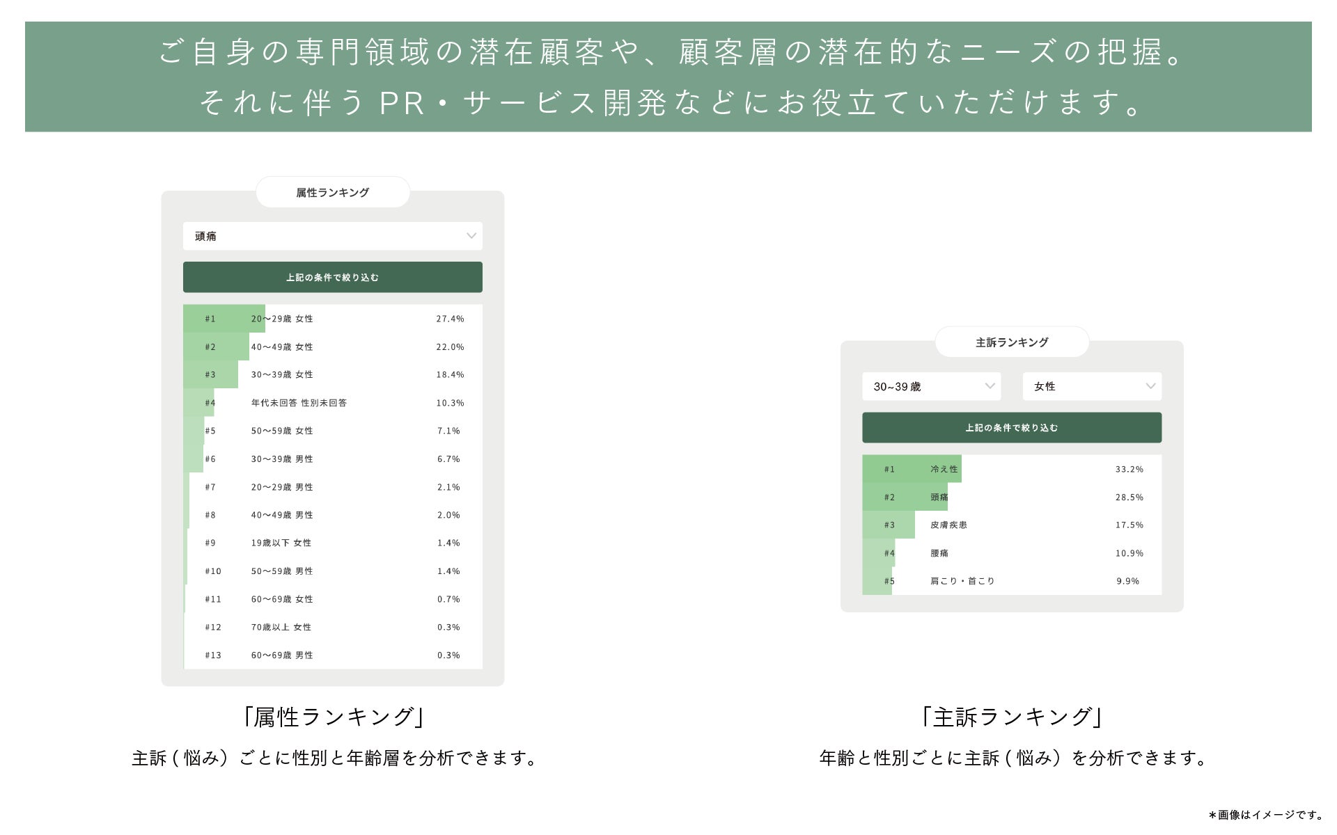 医療・健康業界の発展のために、漢方薬サーチで取得できる匿名データを、皆様にご提供しています。AI分析ツールとして、世の中の健康トレンドを可視化し、顧客のニーズ把握や新サービスの開発にもお役立ていただけます。