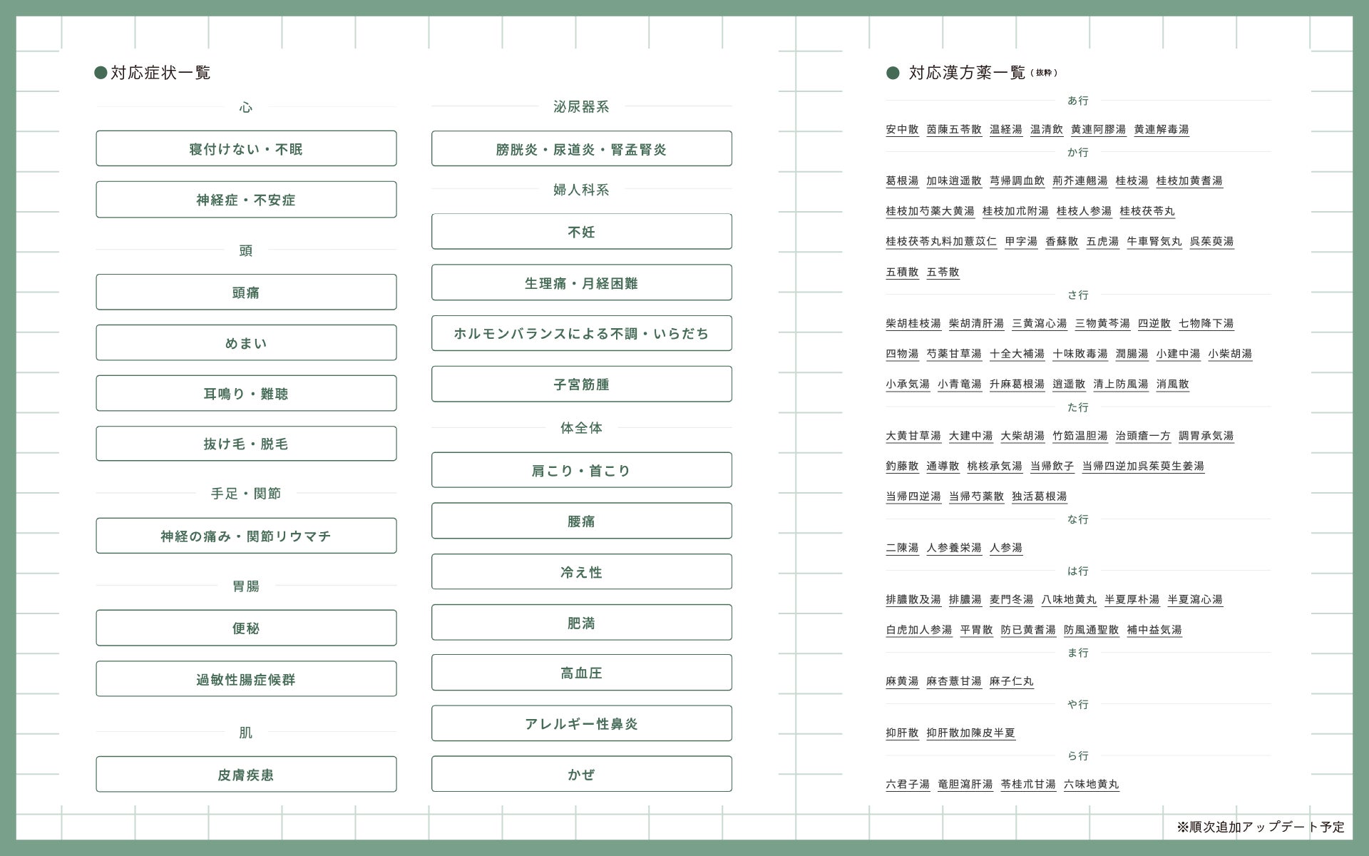 対応症状や漢方薬の詳細な解説など、初めて漢方に触れる方たちに最適な情報を随時アップデート。現在、22個の症状と198種類の漢方薬まで検索可能範囲を広げており、多くのユーザーの皆様のお力になれるようにさらなる開発を進めております。(2024.4.12現在)
