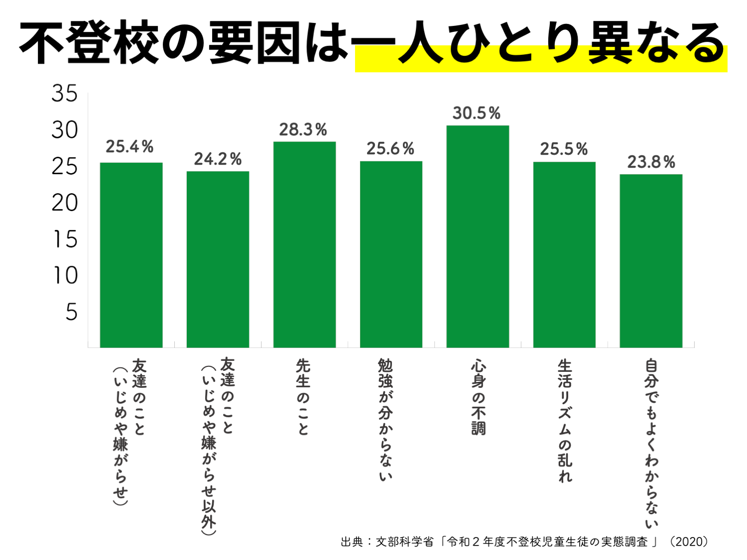 不登校の要因は勉強のことや友だちのこと、先生のことや家庭のことなど多岐にわたり一人一人が異なります。さまざまな要因で不登校になった場合、学習機会が奪われるだけではなく、居場所を失い孤立してしまいます。居場所を失った子どもは「学校に行けない自分はダメな人間だ」「自分には価値がない」と考えてしまうことが少なくなく、その結果自己肯定感や社会性が低下し、何事に対しても前向きに取り組むことができない無気力の状態になってしまいます。