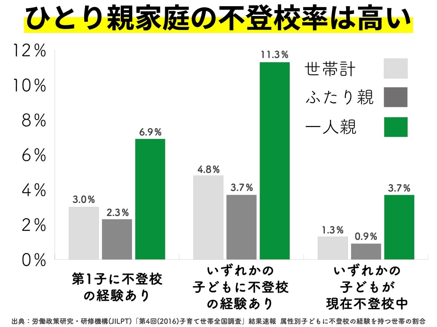私たちのフリースクールを利用している子どもの約6割がひとり親家庭となっています。ビジネス・レーバー・トレン2017年11月号「ひとり親世帯と子どもの生育環境」によれば、子どもが不登校経験ありまたは現在不登校であると回答したふたり親世帯は6.9%であるのに対して、ひとり親世帯は21.9%となっており、データ上でもひとり親家庭の不登校発生率は高いものになっています。