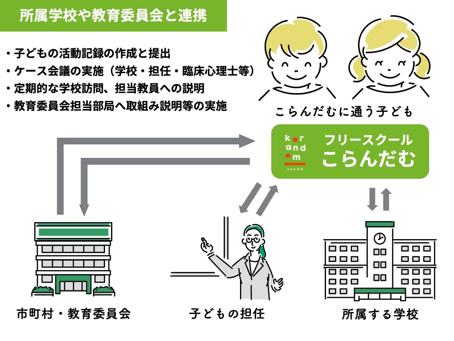 また各市町村の教育委員会や各小中学校とも連携も大切にし、毎月報告書を作成し情報共有に努めています。その結果、子どもが所属する学校より出席認定許可もいただくことができ、子どもの学び場の選択肢として認めていただいています。