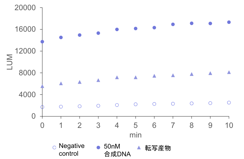 大腸菌プラスミドをPCR法によって増幅を行い、転写反応を用いて1本鎖へと転写した後に、Dozymeと混合することでDozymeの発光をプレートリーダーを用いて観察いたしました(図1)。その結果、大腸菌プラスミドは本手法にて観測可能であることが確認されました。