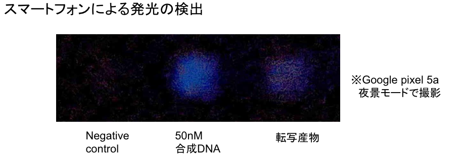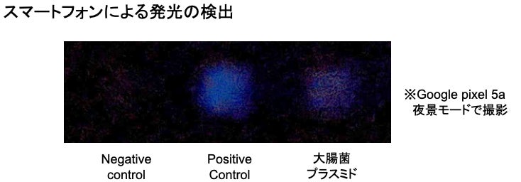 また、この実験にて得られた発光をスマートフォンを用いて観測を行いました(図2)。この結果より、プレートリーダーを用いずに市販のスマートフォンを測定装置として利用した場合でも、Dozymeの発光が観測可能であることが示されております。