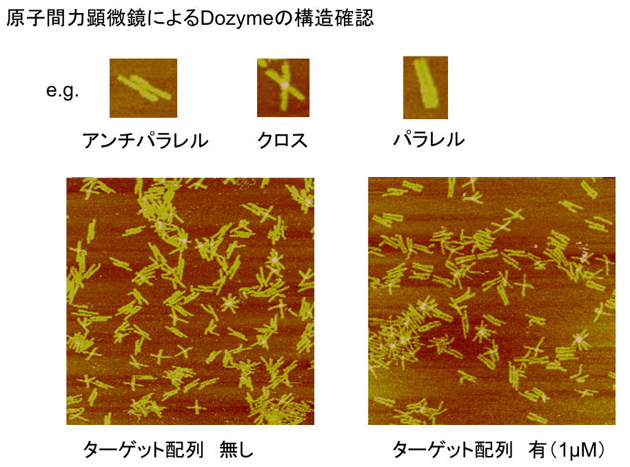 Dozymeは溶液中でアンチパラレル、クロス、パラレルの3通りの構造をとり、「アンチパラレル型では酵素活性がOFFだが、パラレル型では酵素活性がONになる」という性質を人工的に付与、「大腸菌遺伝子の存在下でのみパラレル型が出現する」ことで大腸菌の検出を可能としております。