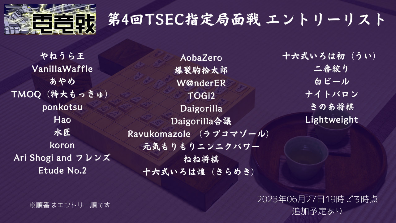 第4回世界将棋AI電竜戦TSEC指定局面戦開催のお知らせ(2023年6月30日~7月1日)