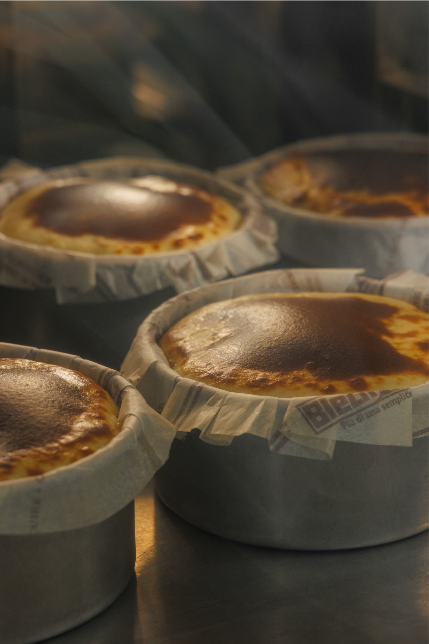 バスクチーズケーキは高い温度で時間をかけずに焼き上げるのが一般的ですが、どうしても硬い仕上がりに。とはいえ、低温の焼成は生地が柔らかすぎてだらけてしまいます。小麦粉を入れない事により滑らかさは出ますが、粘性が落ちるという事もあります。そんな難点をクリアし究極の口どけを実現すべく、私たちが目をつけたのが「熟成」です。