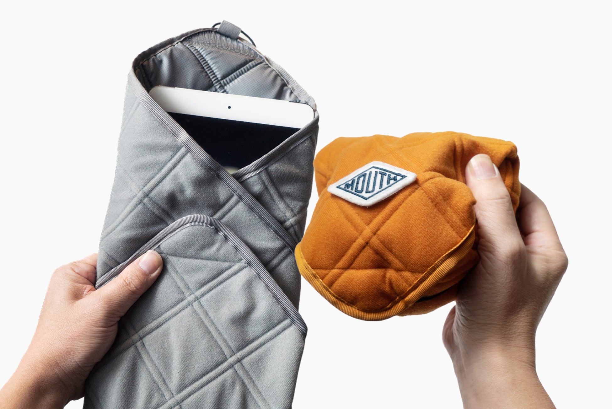 カメラやPC、ゲーム機など大切なモノをさっと包んで保護できる、ステッチ部分に形状保持ワイヤーを14本内蔵した「フレックスマルチラップ-14」。