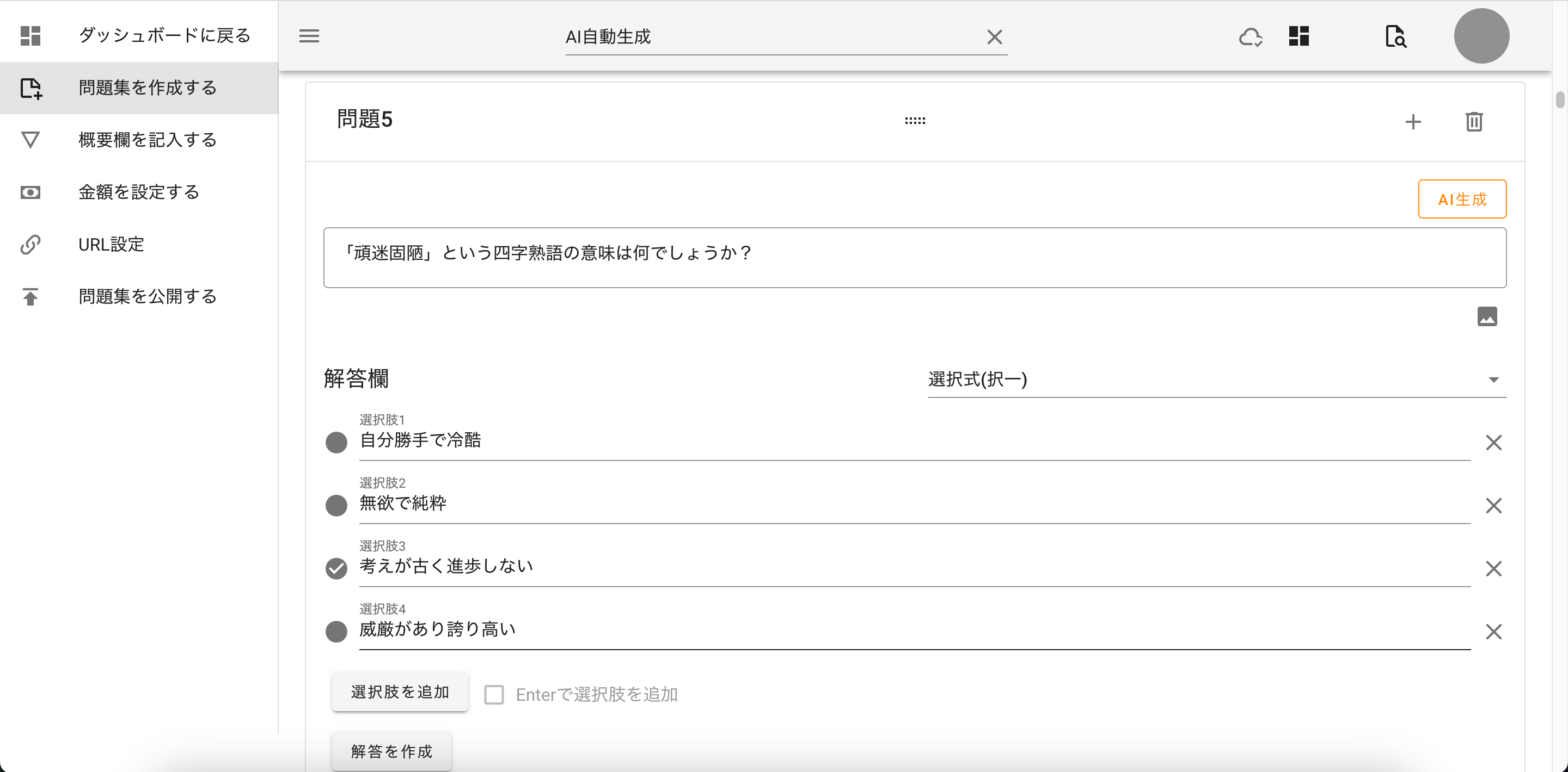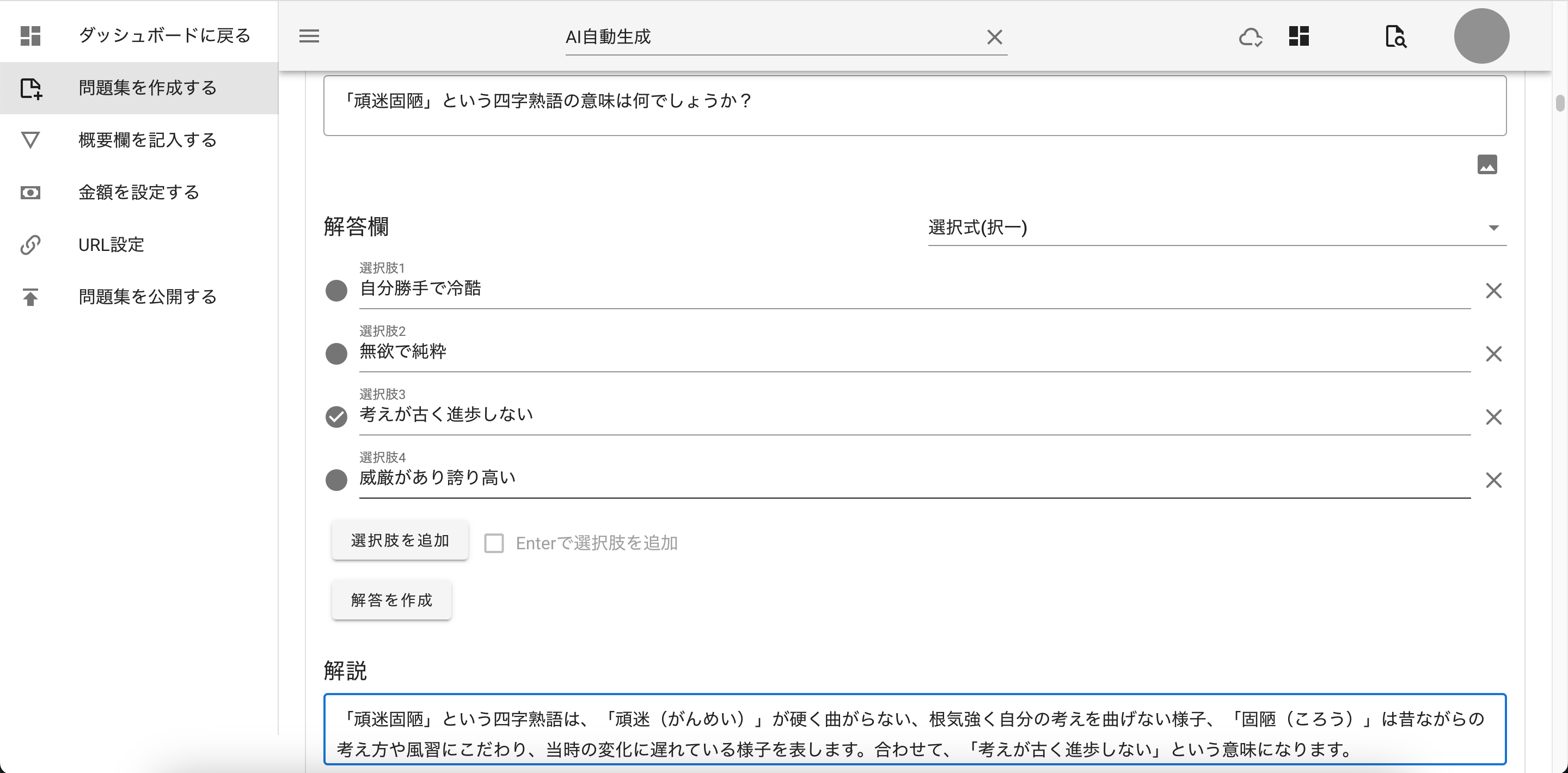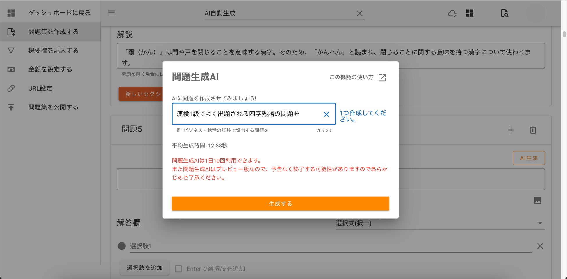 ダッシュボードの「AI生成」ボタンをクリックすると入力画面が出てきます。30文字以内で作成したい問題文について入力します。例として「『漢検1級でよく出題される四字熟語の問題を』1つ作成してください。」のように入力します。