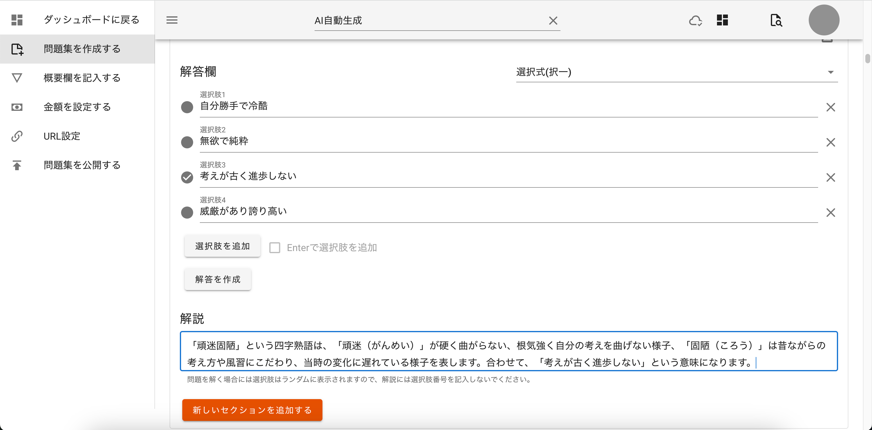 生成すると問題作成ページに自動的に、問題文・選択肢・解説が自動的に反映されるため、講師の方には内容に不備がないかを確認していただく作業のみとなります。