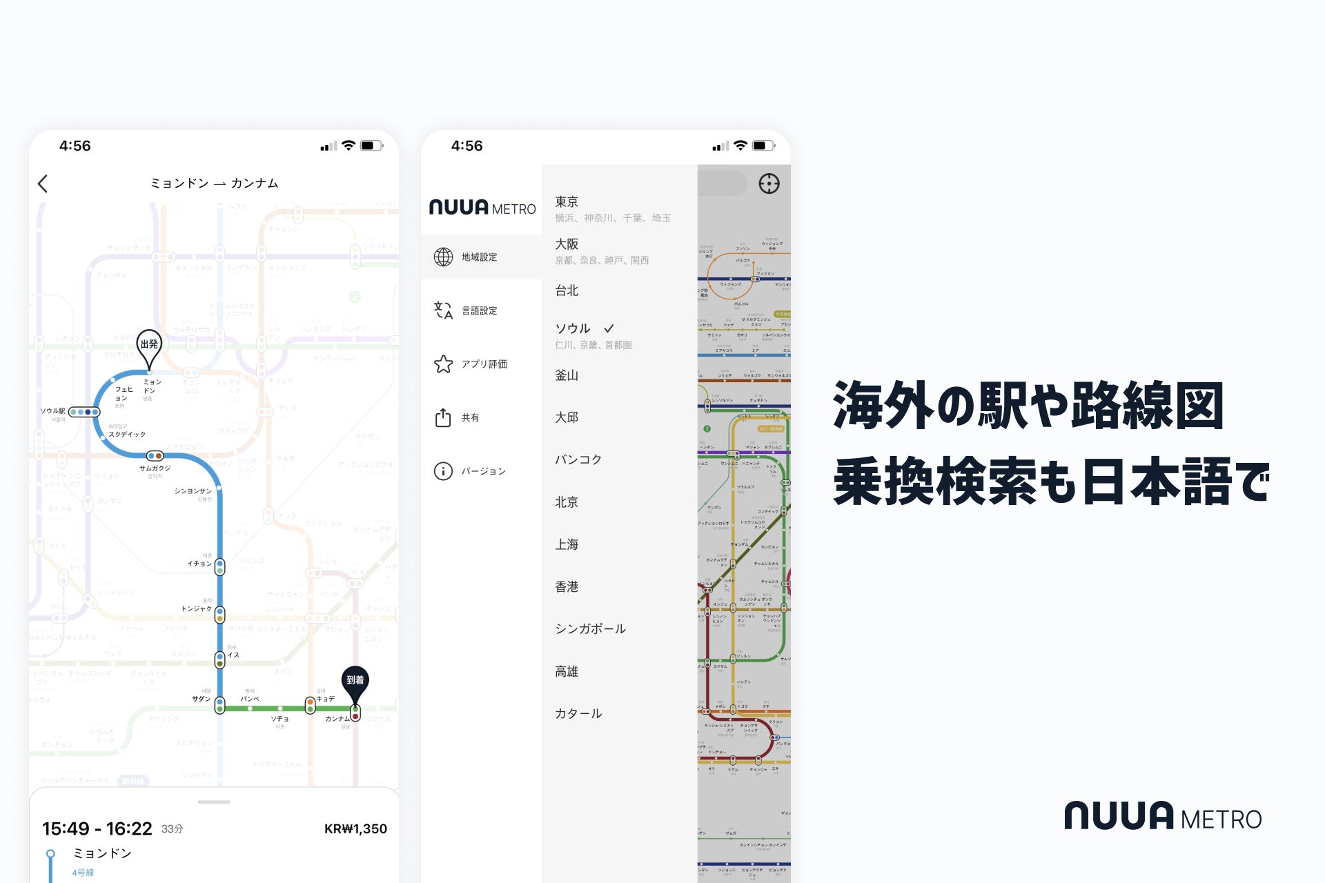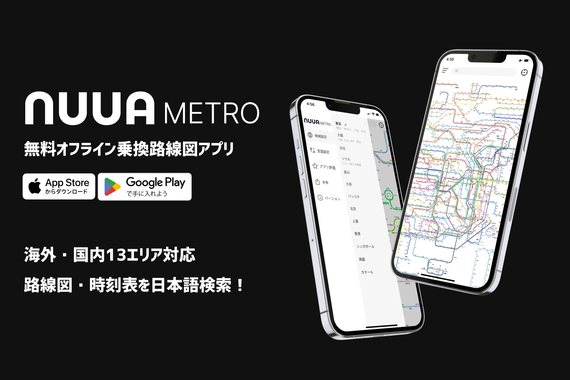 韓国のトラベルテック・スタートアップ、株式会社NUUA(本社:韓国・ソウル、CEO:徐徳進、以下「NUUA」)は、アジア13都市の路線図や駅情報・時刻表を日本語で検索できる無料オフライン乗換案内アプリ「NUUA METRO(読み方:ヌアメトロ、旧・TRIPAI)」を2023年1月12日(木)にリリースいたしました。 日中韓英4か国語対応、対応エリア拡大(海外11エリア・国内2エリア)で、正確かつ見やすく使いやすい乗換案内サービスを提供します。