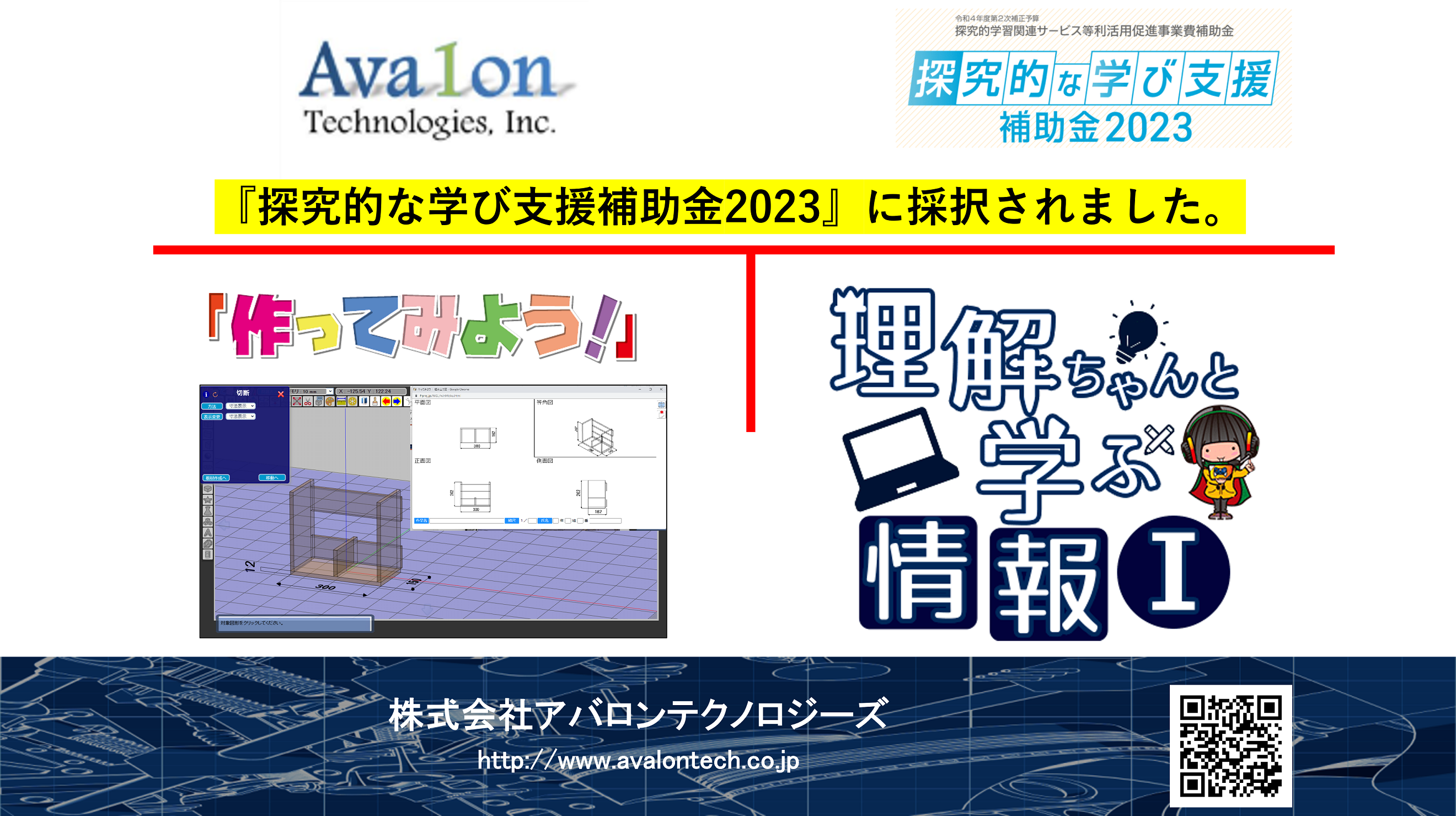 株式会社アバロンテクノロジーズ(本社:東京都新宿区)は同社の探究学習教材である「作ってみよう!」及び「理解ちゃんと学ぶ情報Ⅰ(共通テストコース)」の2つのサービスが経済産業省による「探究的な学び支援補助金2023」に採択されたことを発表しました。都道府県立・市区町村立・私立・国立の学校・フリースクールなどで対象期間中、無償で弊社探究学習プログラムをご導入頂けます。