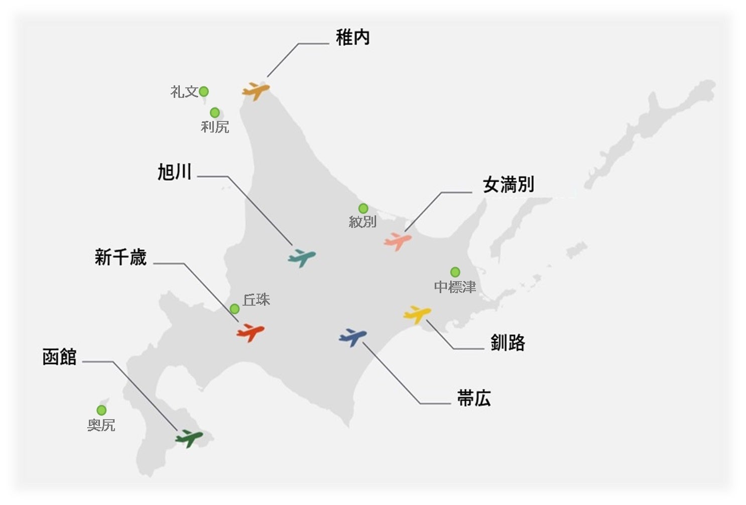 (新千歳:千歳市・苫小牧市、稚内:稚内市、釧路:釧路市・白糠町、函館:函館市、旭川:旭川市・東神楽町、帯広:帯広市、女満別:大空町)