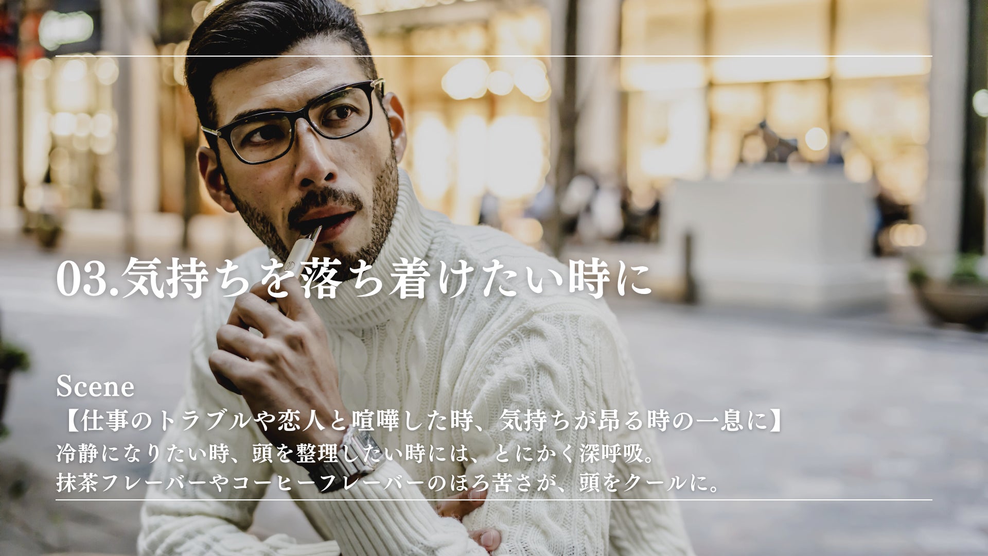 タバコとは異なり人体に有害な成分や嫌な臭いも一切しないため、オフィスや車内などでも利用可能なヘルシーでスマートに睡眠の質や仕事パフォーマンスを高めるリラクゼーションプロダクト。
