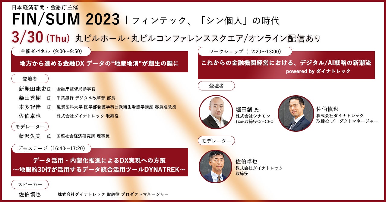 株式会社ダイナトレック(本社:東京都港区、代表取締役:佐伯 譲二、以下「ダイナトレック」)は、2023年3月28日(火)〜3月31日(金)に開催される日本経済新聞社・金融庁主催の金融総合イベント「FIN/SUM 2023」にて、弊社取締役の佐伯卓也・佐伯慎也が登壇することをお知らせいたします。