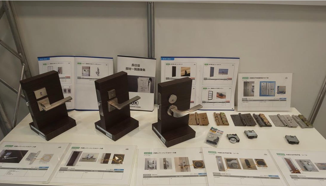 メンテナンスを容易にするために互換性をもたせた部材·部品である「CjK部材(※1)」をご紹介します。屋根瓦から室内ドアのレバーハンドルや丁番など、大きなものから小さなものまでその数なんと147品目!その一部をブース内で展示しています。