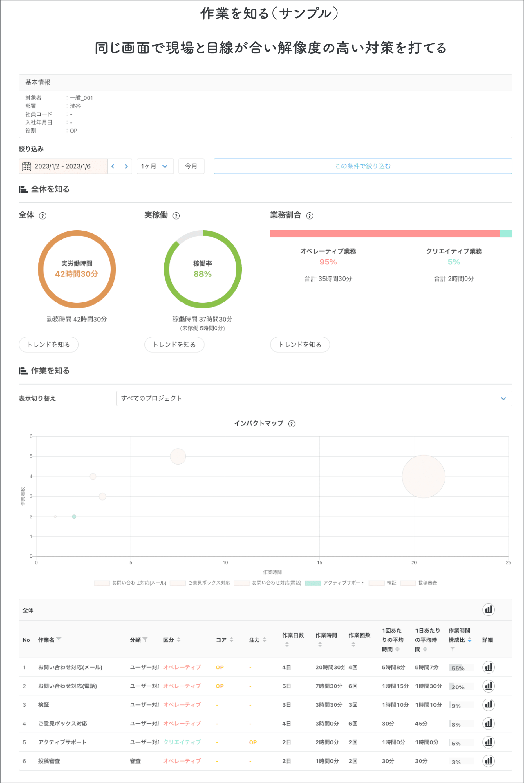 業務を可視化しても、はじめは「へぇ、現状はこうなんだ」というのが正直な感想でした(笑)。それでも何度か見ていくうちに、一過性のことではない問題にあたりをつけることができました。それに可視化されると徐々に改善したくなってきますよね(笑)。