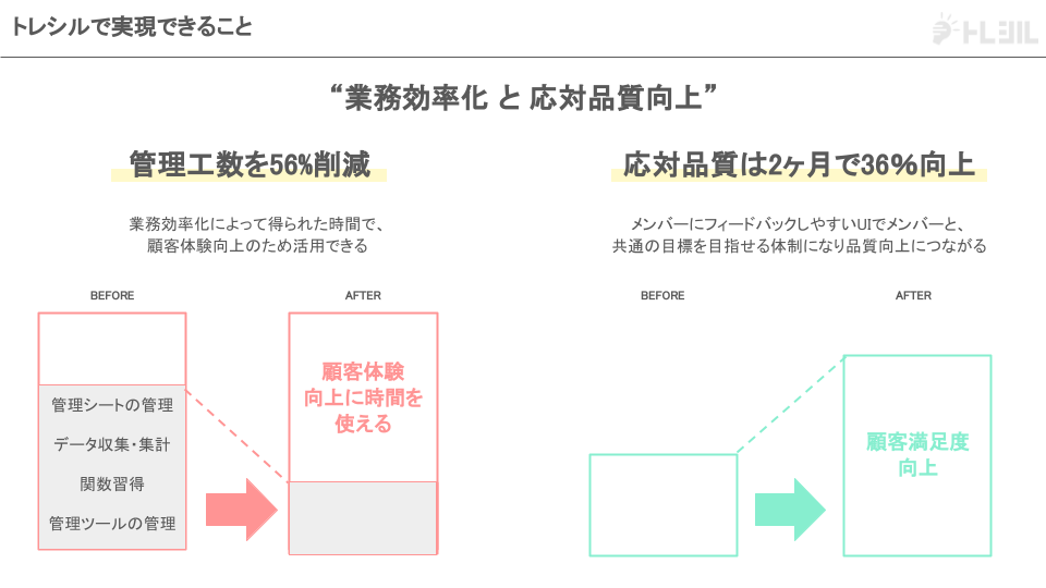 導入前に試算していた通り業務効率化により管理工数を56%削減できただけでなく、応対品質では社内と社外の評価をどちらも上げることができました。