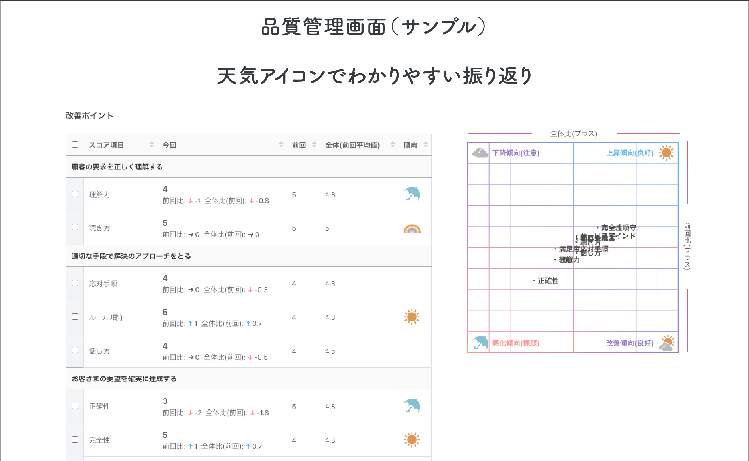 目標の達成度合いによりトレシルの画面に変化が起きるのも楽しいです。評価結果が悪かったら「雨」、良かったら「晴れ」など遊び心のある表現が人気で、それを見ながらオペレーター主導で前向きに取り組むことができています。チーム定例でもオペレーターのみんなとトレシルの同じ画面を見ることで「あともう一息でKPI達成できるね」とオペレーターと共通の目標を目指せる体制になりました。