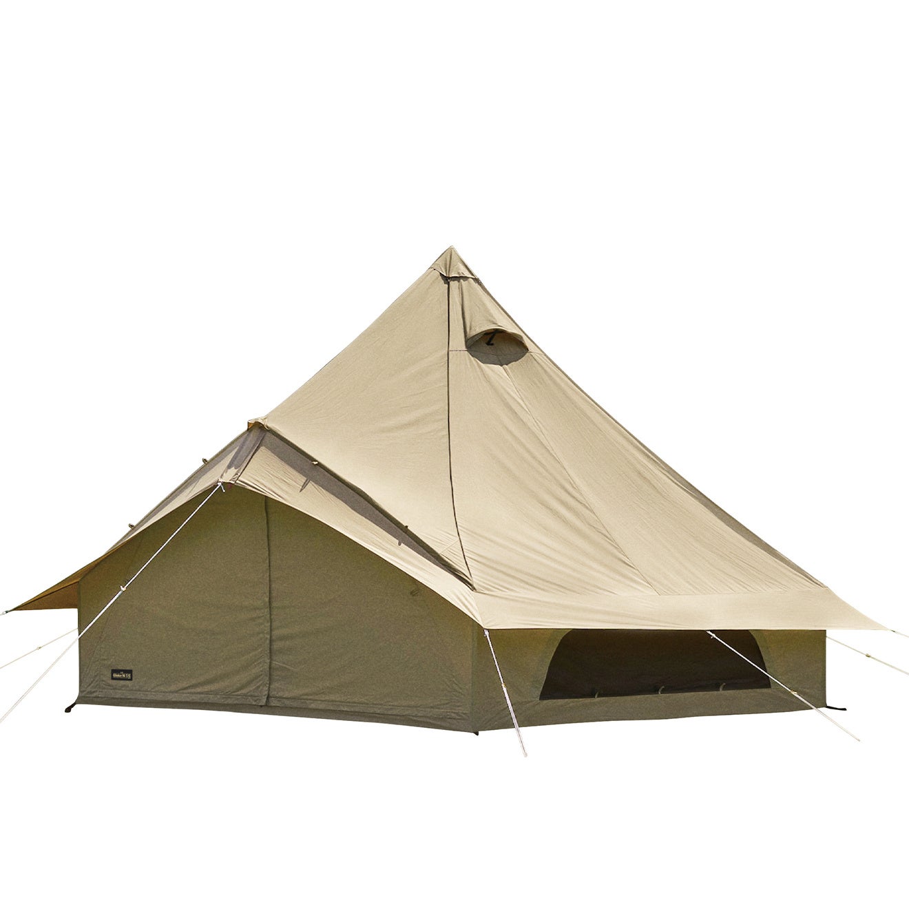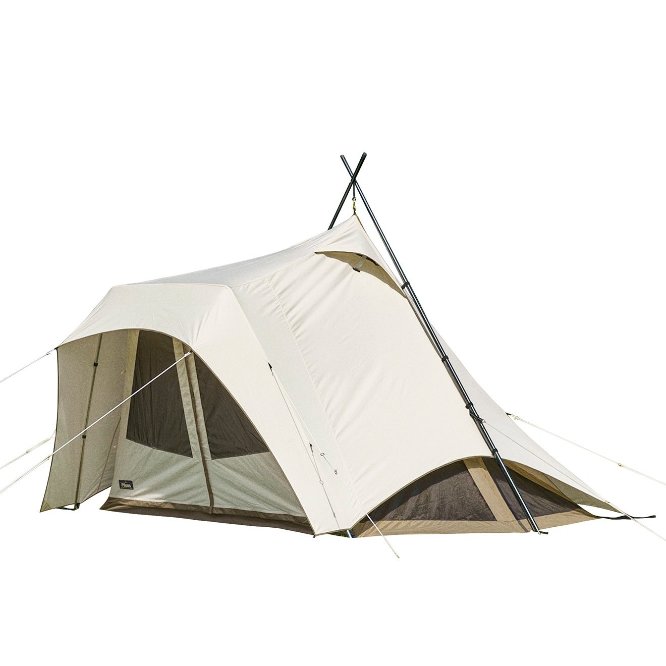 前面フラップが2段階に広がって、多彩なアレンジが楽しめるテント。