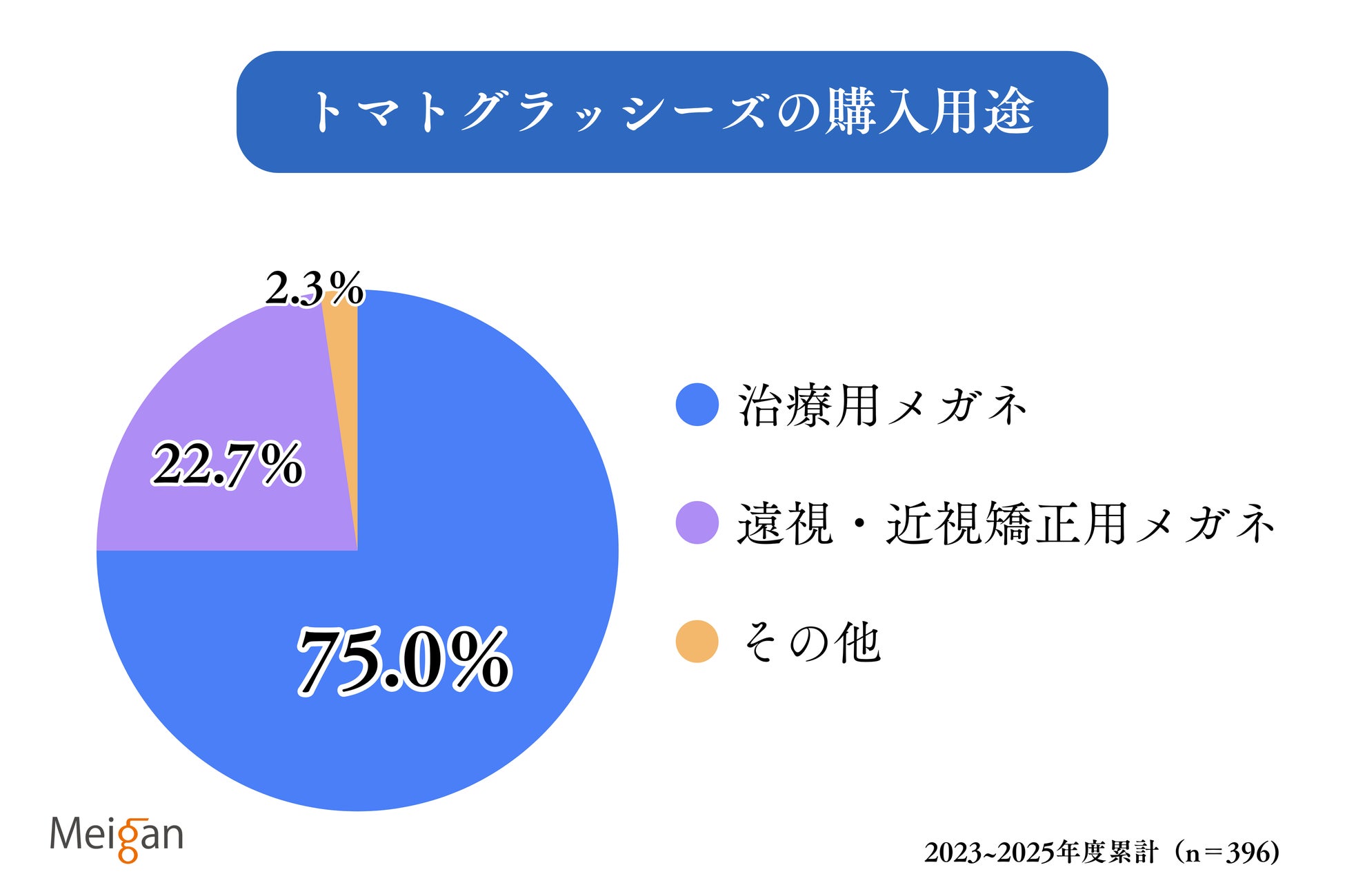 名古屋眼鏡は、こども用メガネ「トマトグラッシーズ」の日本国内総代理店として15年以上国内流通に携わってきました。トマトグラッシーズの購入者向けアンケートによると、約75%の購入者に「弱視・斜視の治療用メガネ」として使用いただいています(n=396)。