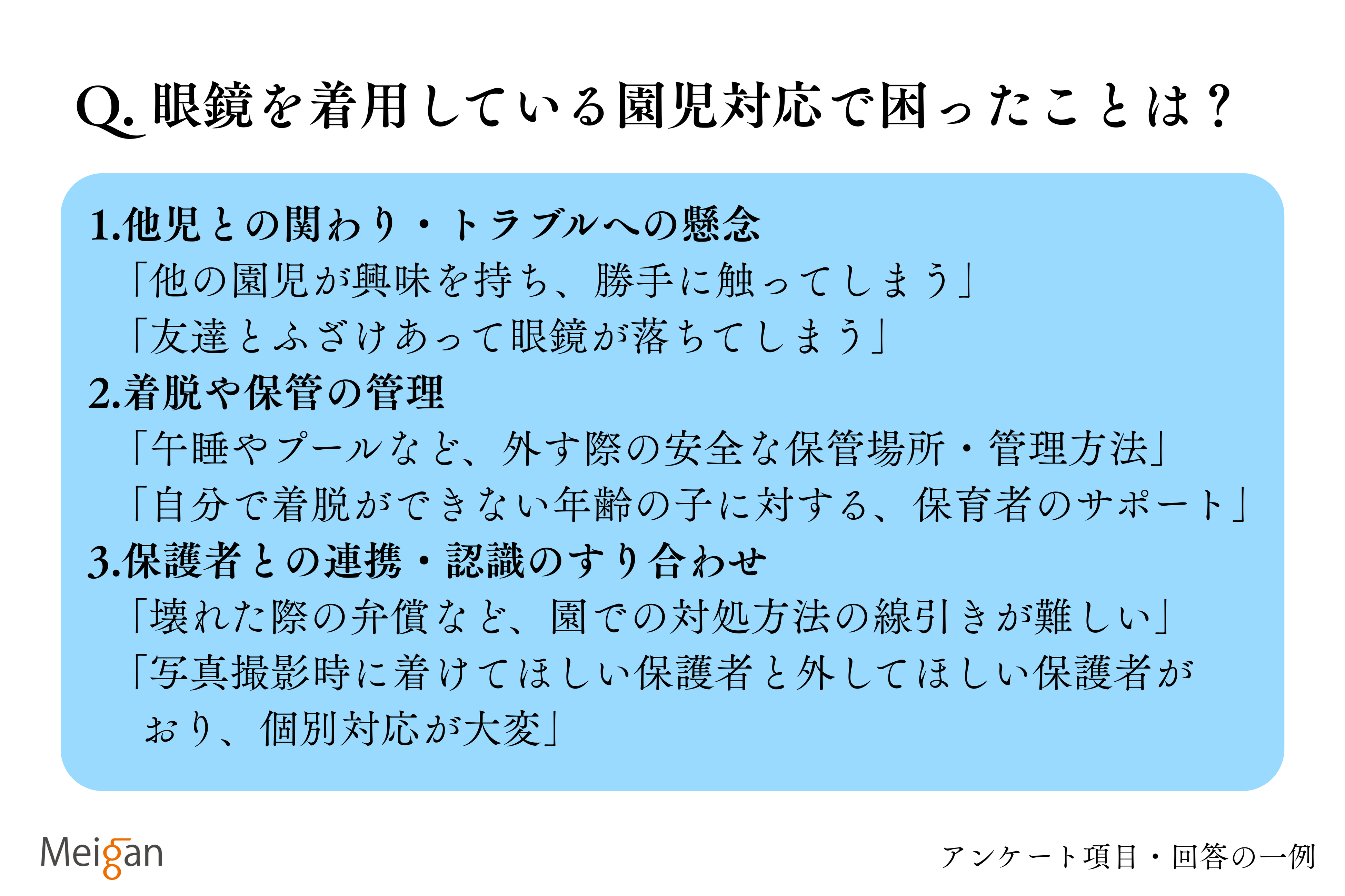 本プロジェクトではこの課題を解決すべく、学生の視点を取り入れたサポートブックを制作しました。協力園39園へアンケートを通じて現場のリアルな実態をヒアリングし、保育者が抱えるメガネ取り扱いの疑問や不安を解消するための情報、弱視等治療におけるメガネの重要性などをわかりやすくまとめています。