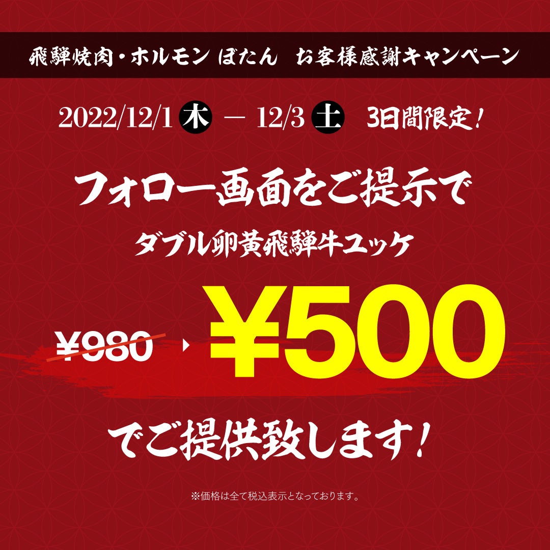12月1日(木)〜3日(土)の3日間限定で「ダブル卵黄飛騨牛ユッケ」¥980(税込)を¥500(税込)でご提供いたします。是非この機会にご来店下さい。