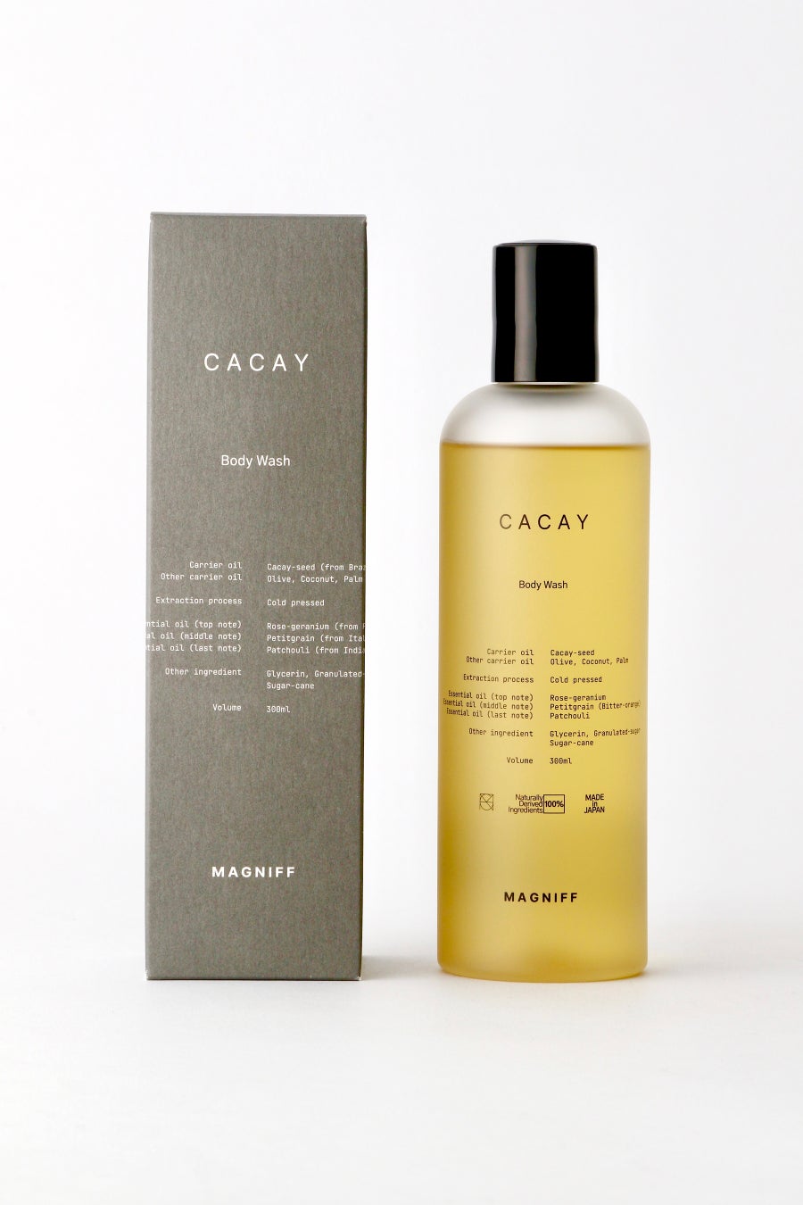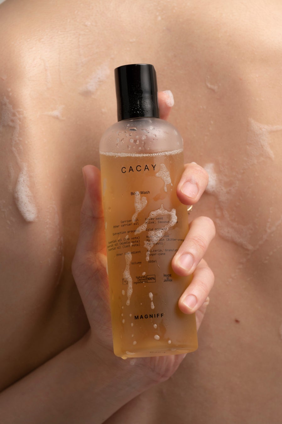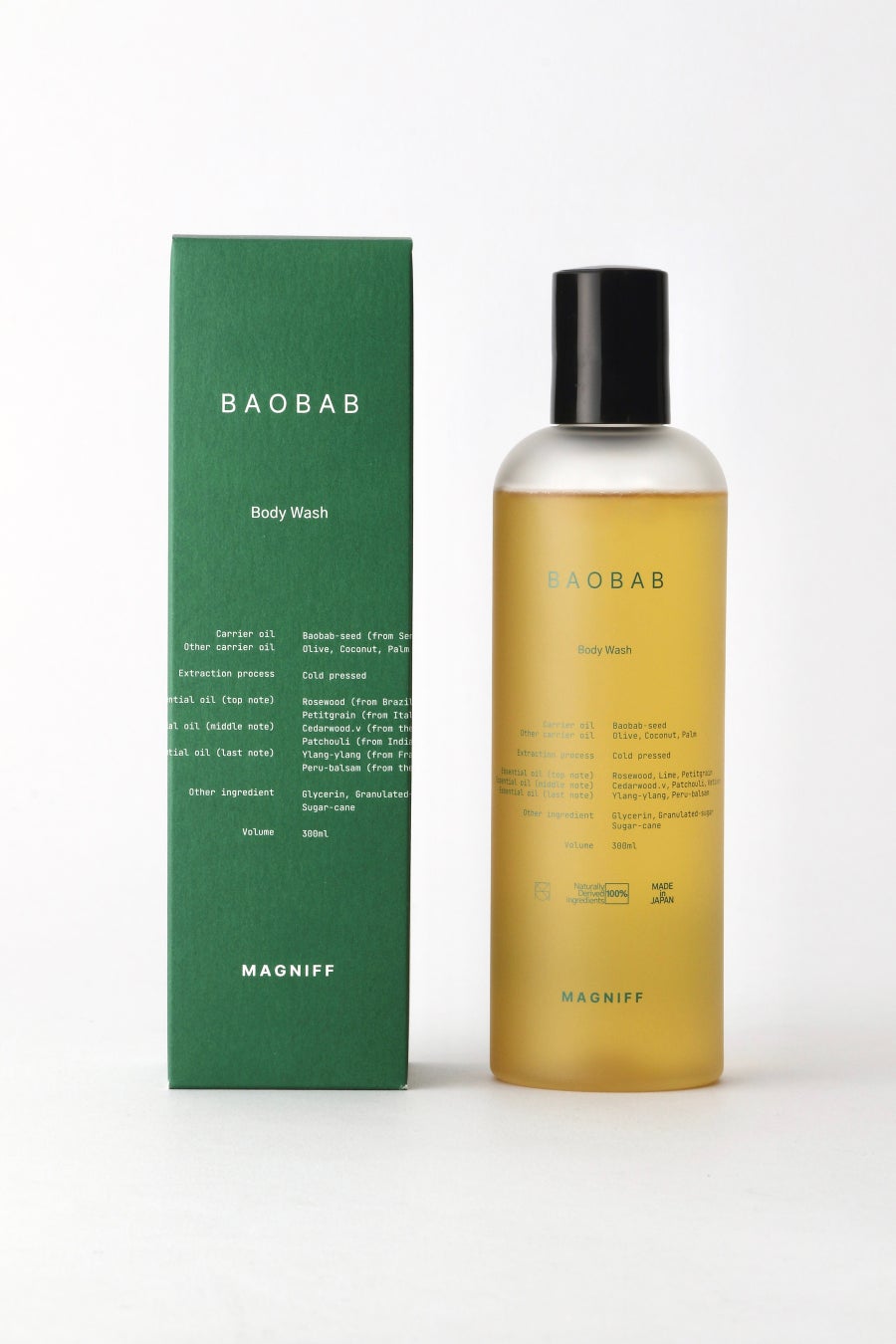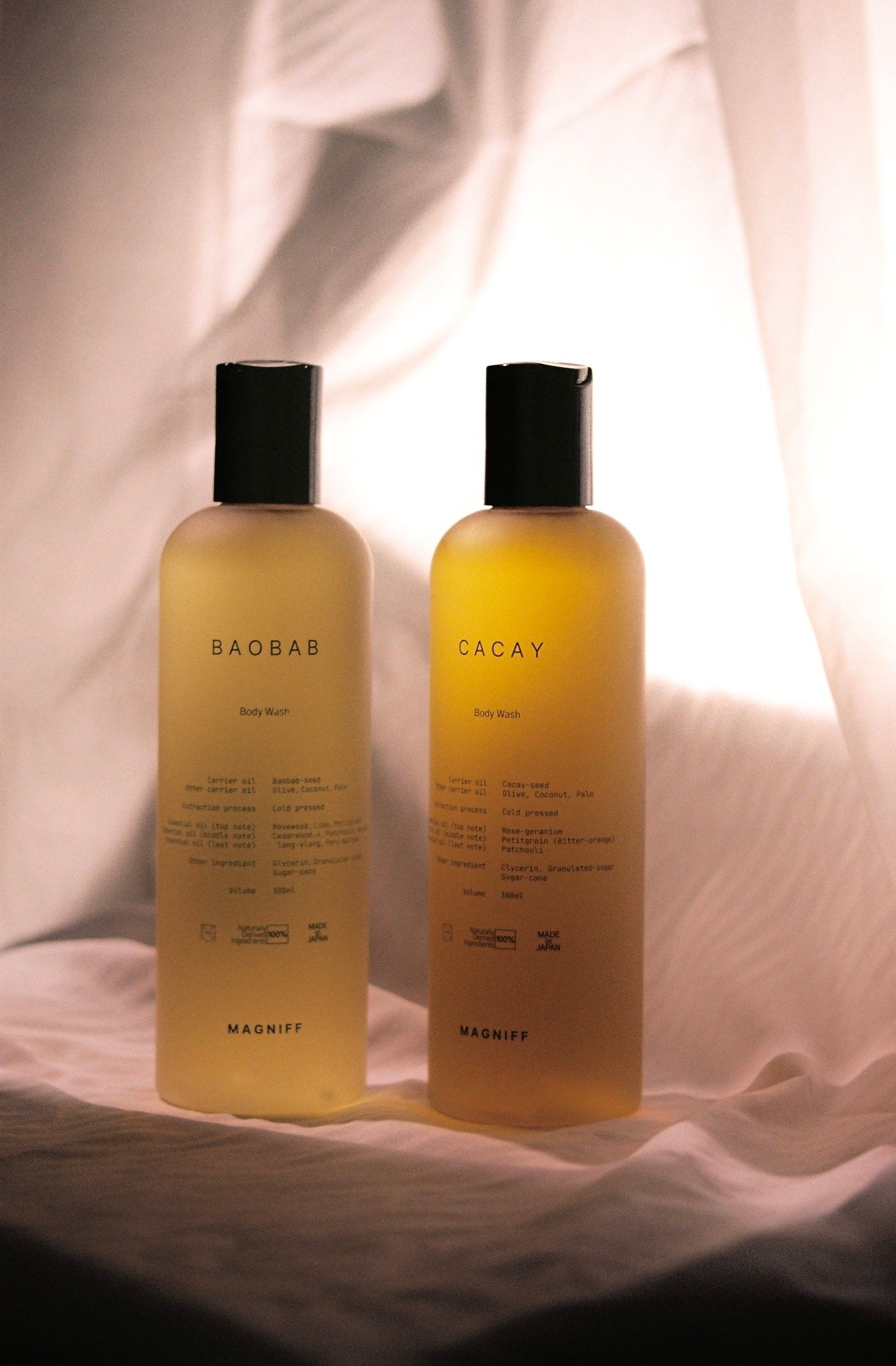 〈MAGNIFF〉のボディウォッシュは伝統的な製法にリスペクトを払い、植物オイルから直接に液体石けんをつくる「直接鹸(けん)化製法」で作られている。しっかりと皮脂汚れを落として洗い上げつつ、植物オイルが本来持つ保湿成分を壊さずに肌に届ける*¹、天然由来のボディウォッシュだ。