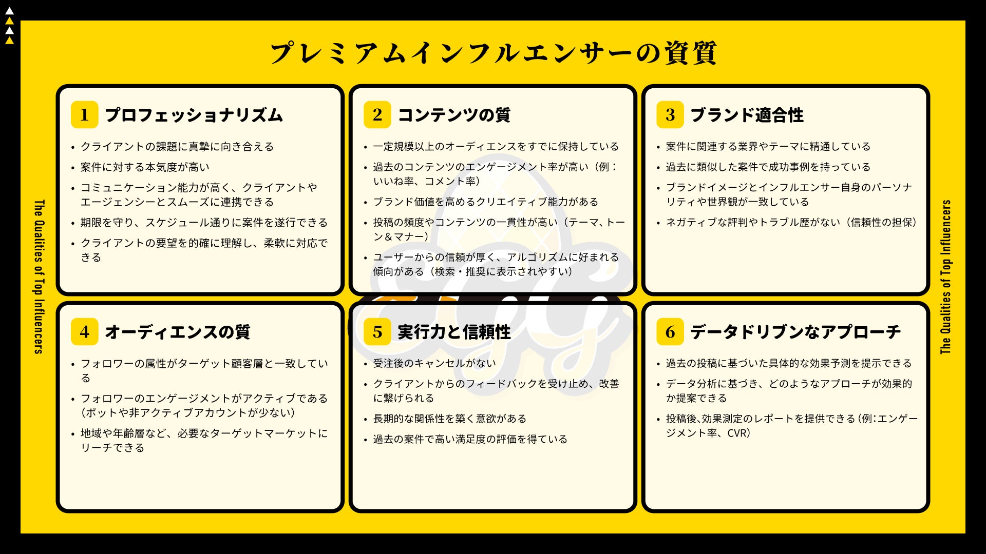 一流のインフルエンサーによる高いプロフェッショナリズムと、確実な成果を求めるクライアントにとって、安心して案件をお任せいただける環境をご提供します。