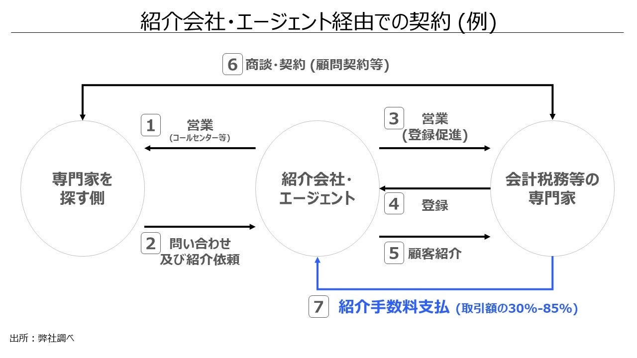 また、下記図が示す通り、既存の第三者経由での案件獲得では手数料が高額で、一定の実績・能力を有し案件獲得に困らない専門家にとっては、登録するインセンティブが無い状況です。