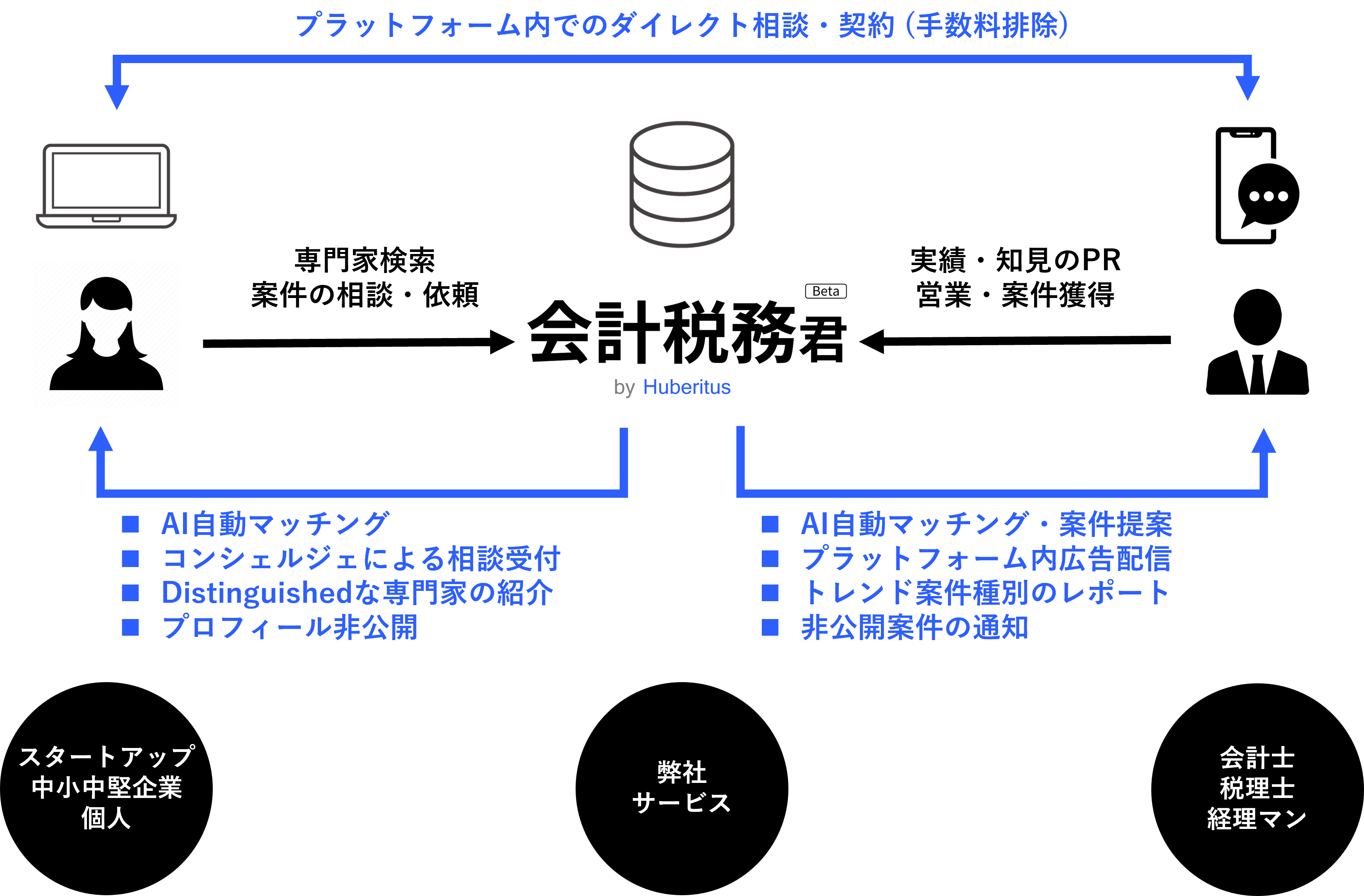 「会計税務君」では、各専門家の実績や評判などを可視化し透明性を高めた上で、従来業界において課題となっていた紹介手数料を排除し、テクノロジーを活用した「会計・税務サービス提供の新たなプラットフォーム」構築を目指します。