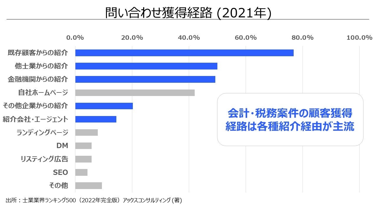 下記図が示す通り、会計・税務の専門家の顧客獲得経路は、各種紹介が主要チャネルとなっています。これは、知人の紹介する方に依頼すれば安心感があるため、一定の合理性があると考えています。