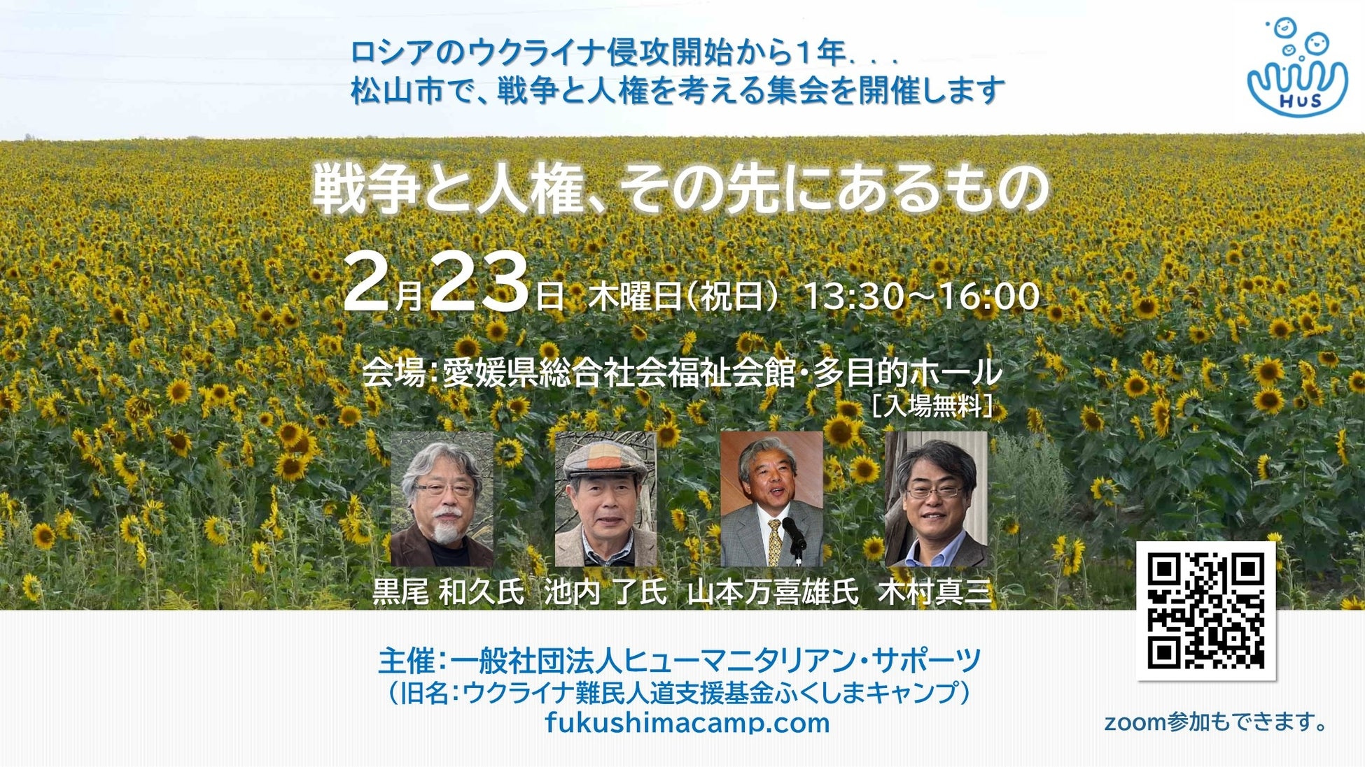 一般社団法人ヒューマニタリアン・サポーツ(所在地:福島県二本松市 代表理事:木村 真三)は、2023年2月23日(木曜日・祝日)に愛媛県総合社会福祉会館(松山市)にて、シンポジウム「戦争と人権、その先にあるもの」を開催いたします。講師には国立重監房資料館部長で考古学者の黒尾 和久氏、名古屋大学名誉教授で宇宙物理学者の池内 了氏、愛媛大学名誉教授で教育研究者の山本 万喜雄氏の3名を迎え、ロシアのウクライナ侵攻開始から1年が経過した今、戦争と人権について語っていただきます。司会と進行は獨協医科大学准教授で放射線衛生学者の木村 真三が行います。当日はオンラインでも開催され参加費はいずれも無料。また福島県二本松市にサテライト会場を設置、同時視聴や質疑応答等での参加を可能と致しました。
