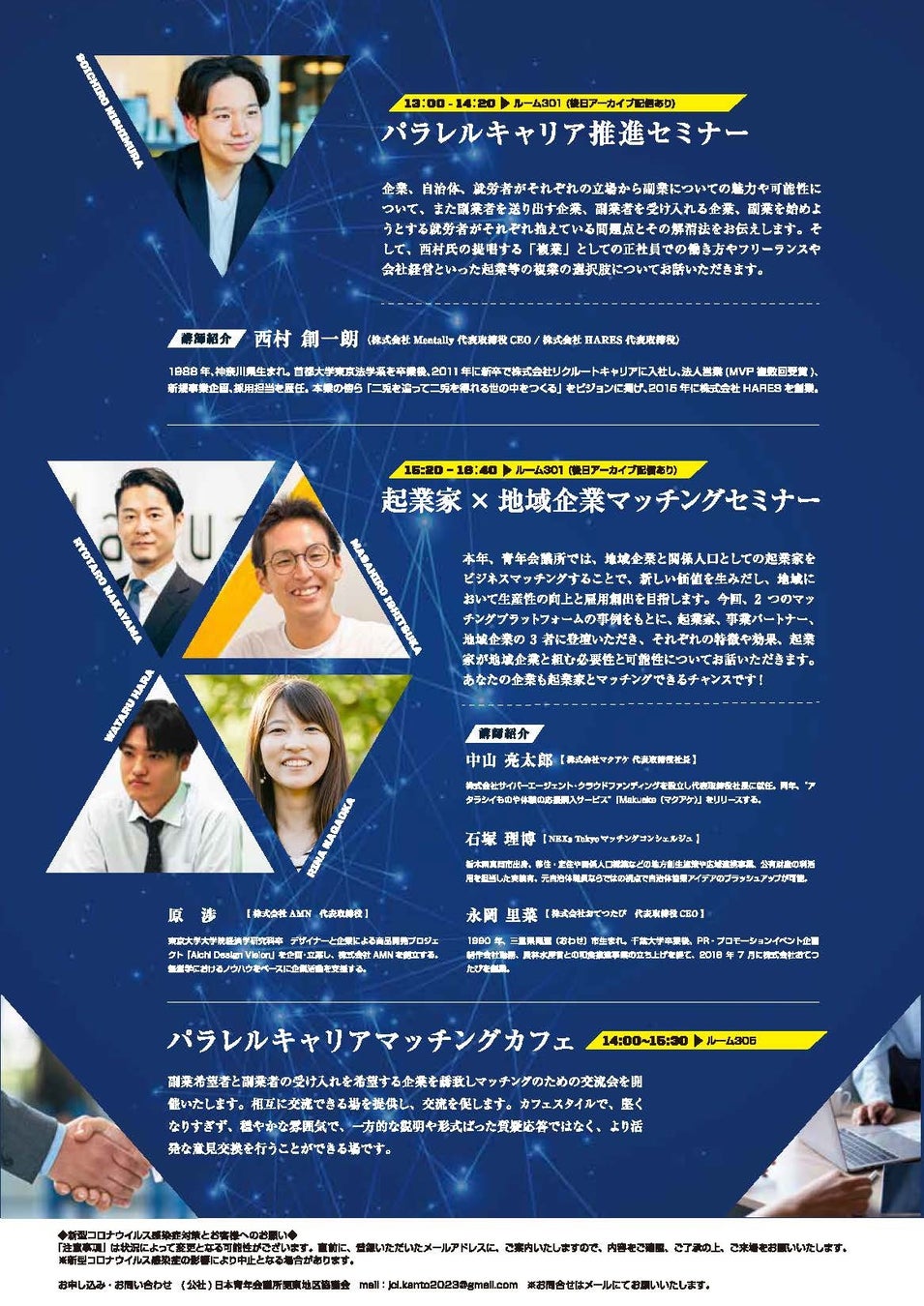 内容:関東地区協議会では、NEXsTokyoと株式会社マクアケをマッチングパートナーとして、地域企業と起業家のマッチングを⾏って参ります。セミナーでは、起業家と地域企業とのビジネスマッチングの実例を⽰すことにより、起業家と地域企業が互いに興味を持ち、ビジネスマッチングを求める⾏動を促します。そして⾏動の結果、地域への関係⼈⼝の創出につなげて参ります。