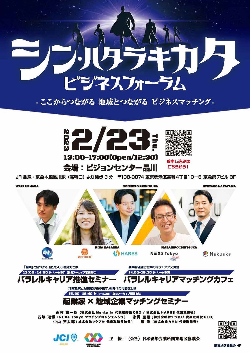 公益社団法⼈⽇本⻘年会議所 関東地区協議会では、広域経済圏の構築と確⽴を⽬指し、2023年2⽉23⽇(⽊・祝)、東京都品川区のビジョンセンター品川にて「シン・ハタラキカタ ビジネスフォーラム〜ここからつながる 地域とつながる ビジネスマッチング〜」を開催致します。